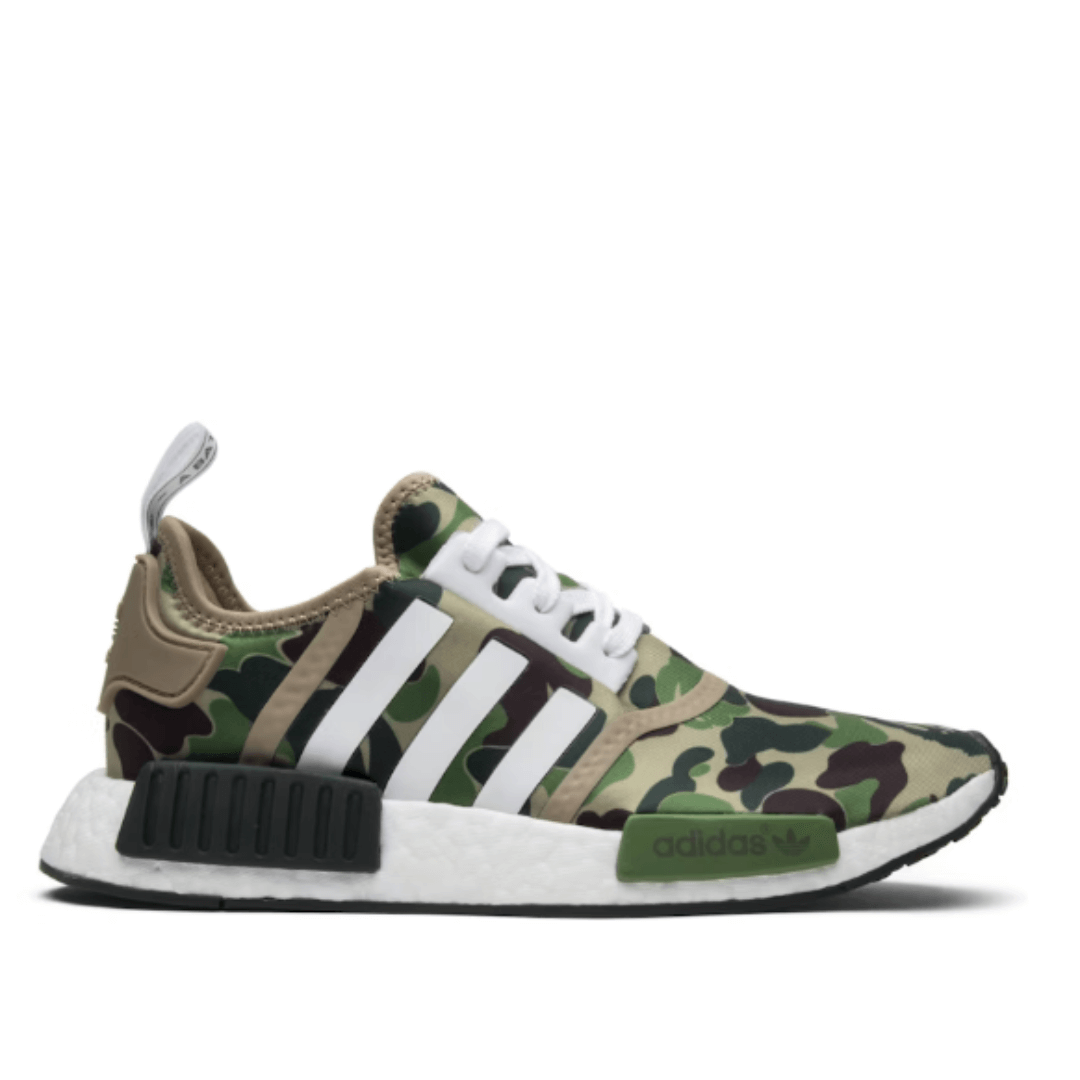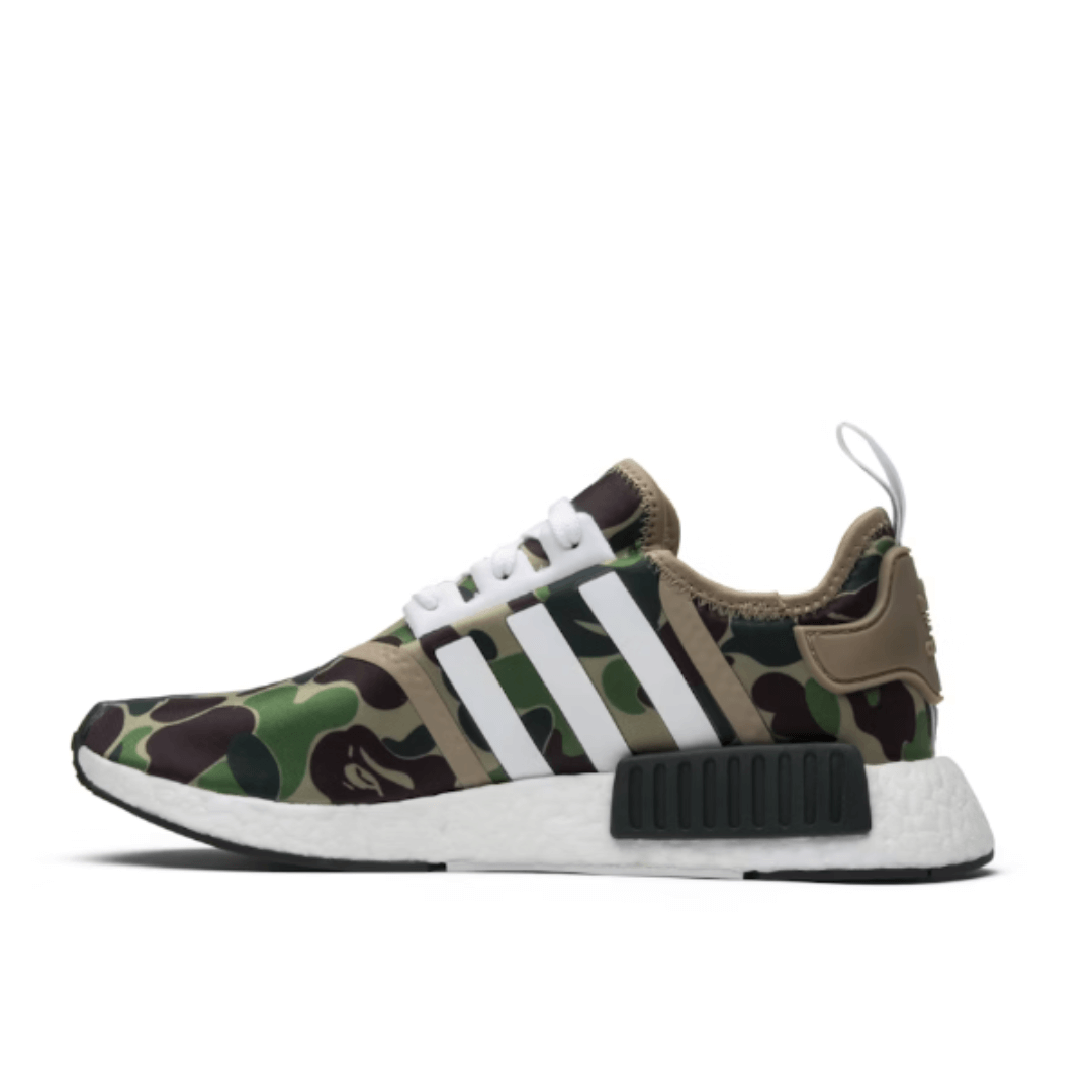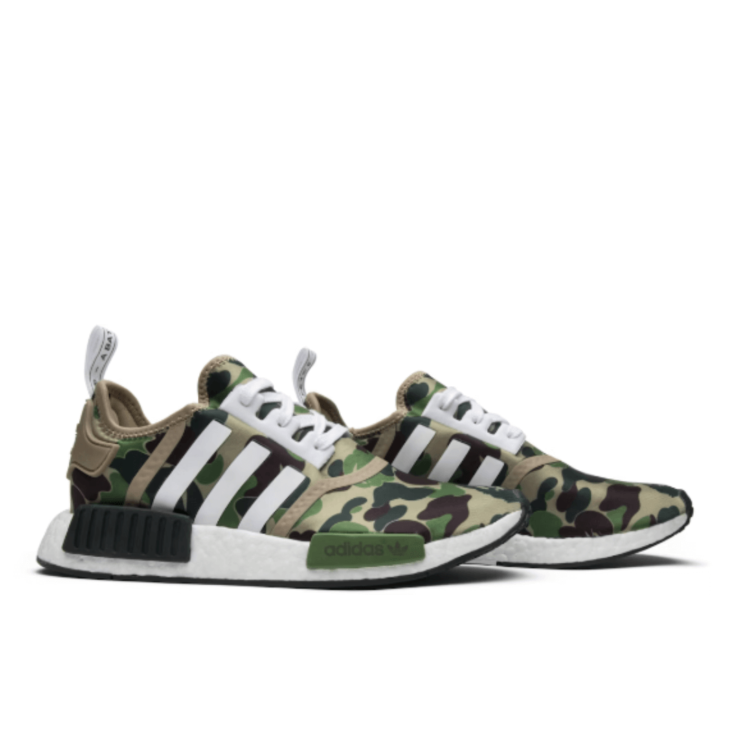 The NMD R1 BAPE Olive Camo features a sock-like construction, which provides a snug and comfortable fit. The upper is constructed from a combination of materials, including breathable mesh and synthetic overlays. The mesh material enhances breathability. The lacing system and the sock-like construction of the adidas NMD R1 BAPE Olive Camo contribute to a snug and comfortable fit. The collar of the shoe is often padded, enhancing comfort around the ankle area.