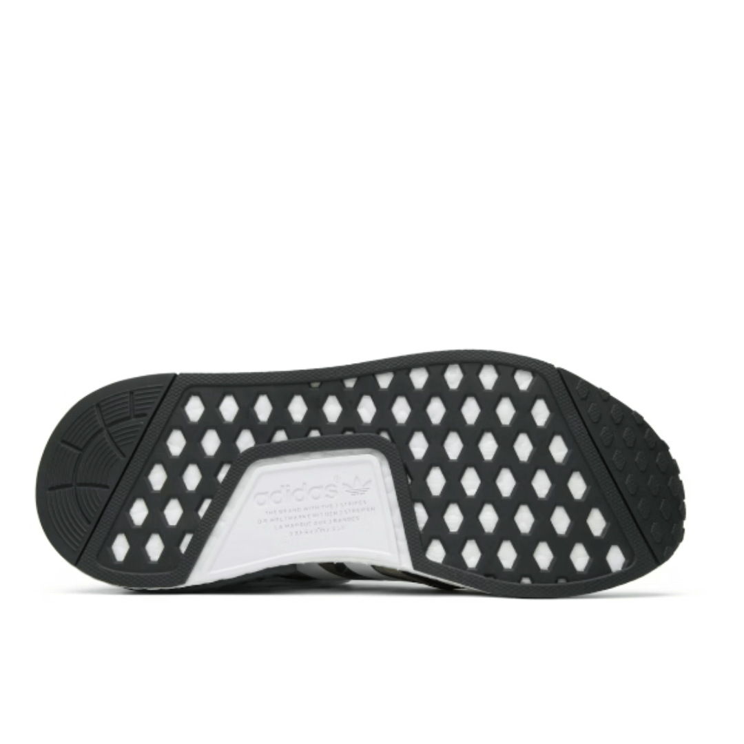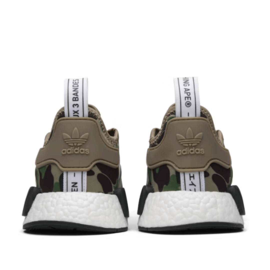The upper of the adidas NMD R1 BAPE Olive Camo features an “Olive Camo” pattern, a signature BAPE design element. The camouflage pattern is executed in shades of olive green and brown.