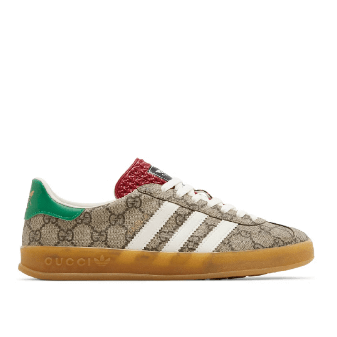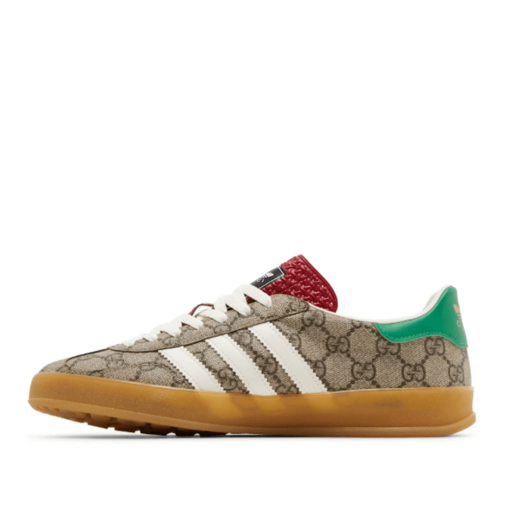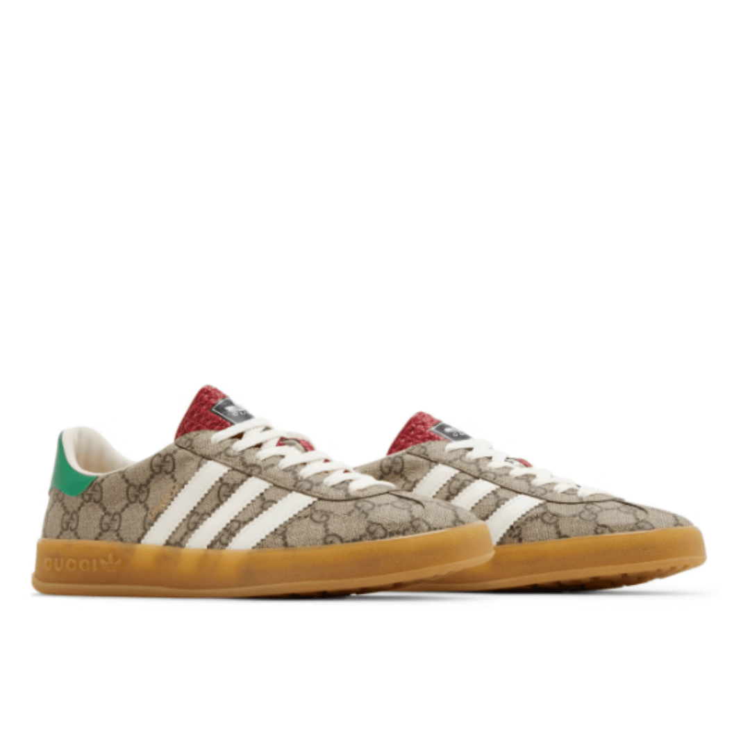 The adidas x Gucci Gazelle Beige GG Monogram combines signature design references from adidas and Gucci, creating a sneaker with streetwear and luxury fashion roots.