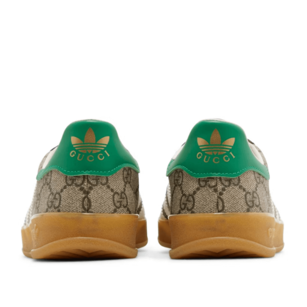 The upper features the iconic “GG” monogram set against a Beige Tone base. The serrated 3-Stripes logo is crafted from white leather and serves as a heritage adidas detail. Red covers the flat tongue while green graces the heel tab, paying homage to Gucci’s colors and founder Guccio Gucci’s Italian heritage. The heel tab displays an adidas trefoil and “GUCCI” in metallic gold script, while the tongue showcases additional Gucci and adidas dual branding.