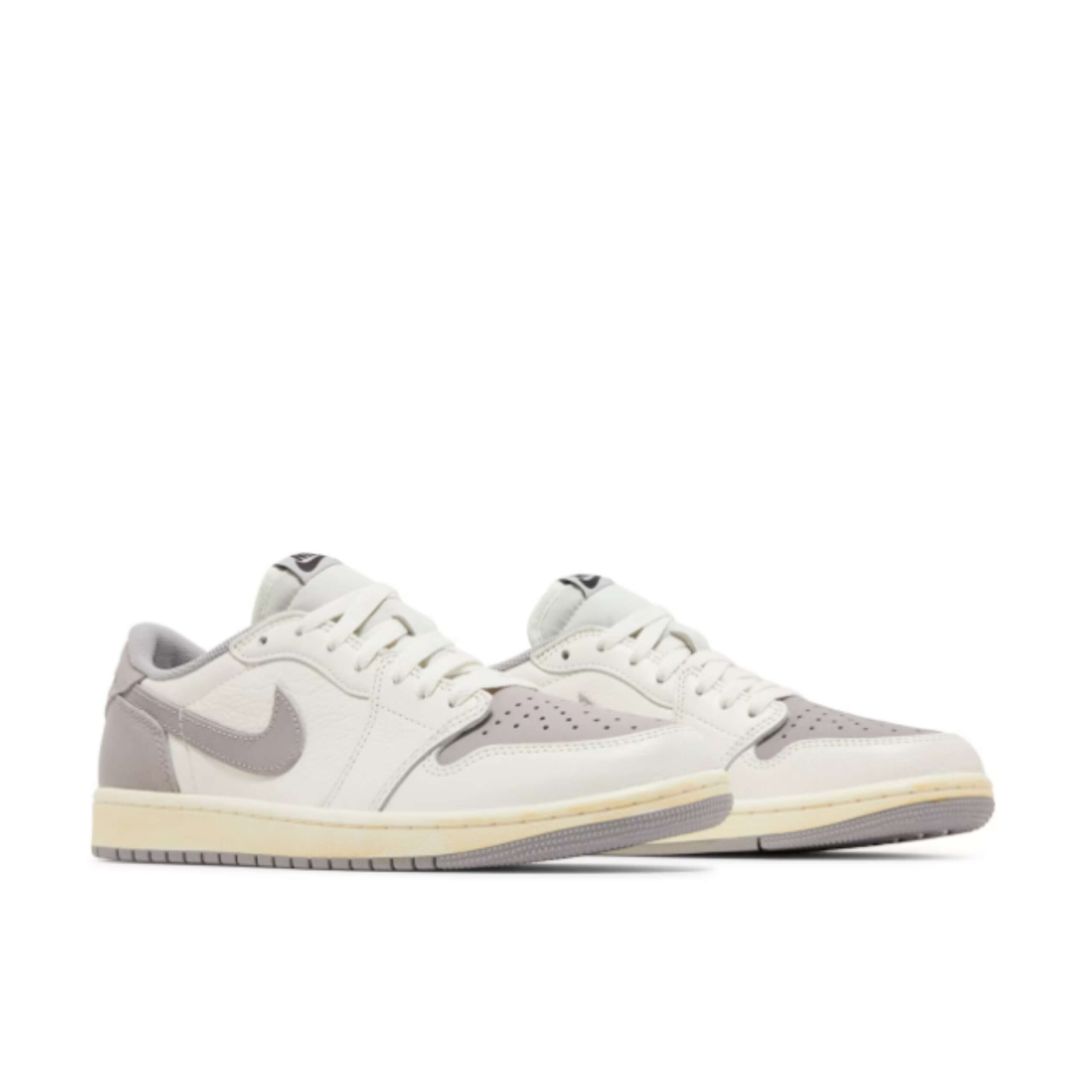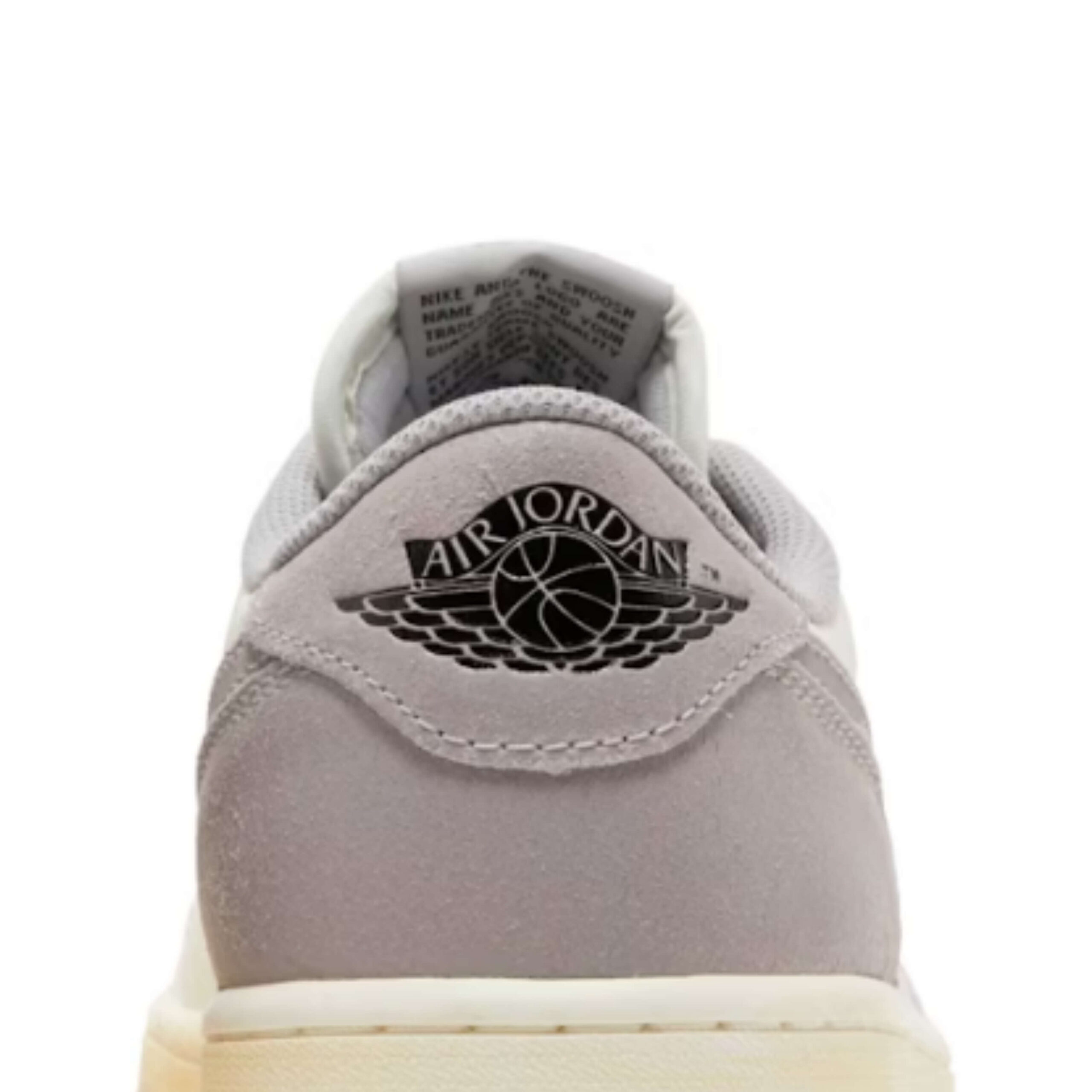 The Jordan 1 Retro Low OG Atmosphere Grey is a low-cut basketball-inspired sneaker that features a minimalistic design. It is constructed using premium materials, including a mixture of genuine leather and synthetic material.