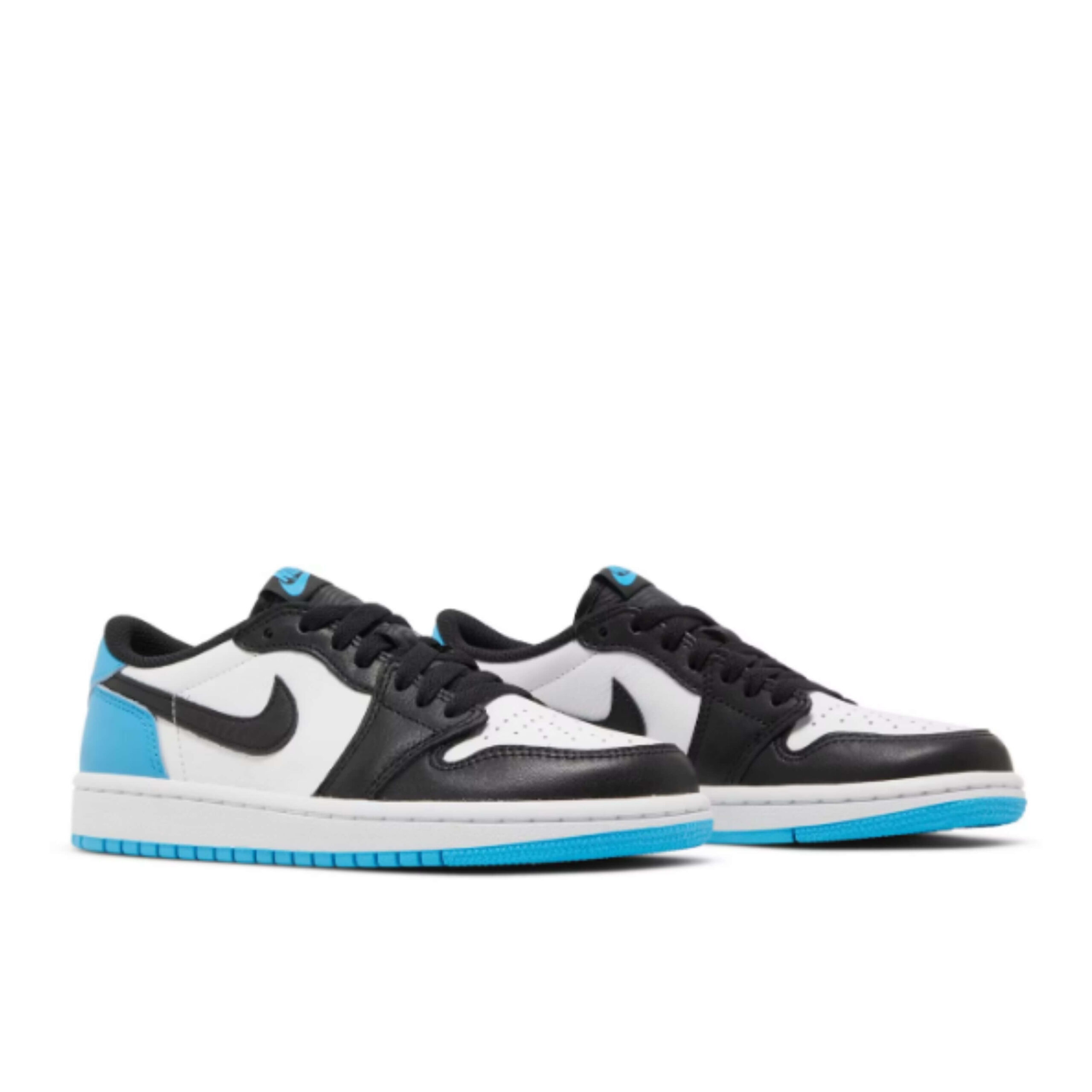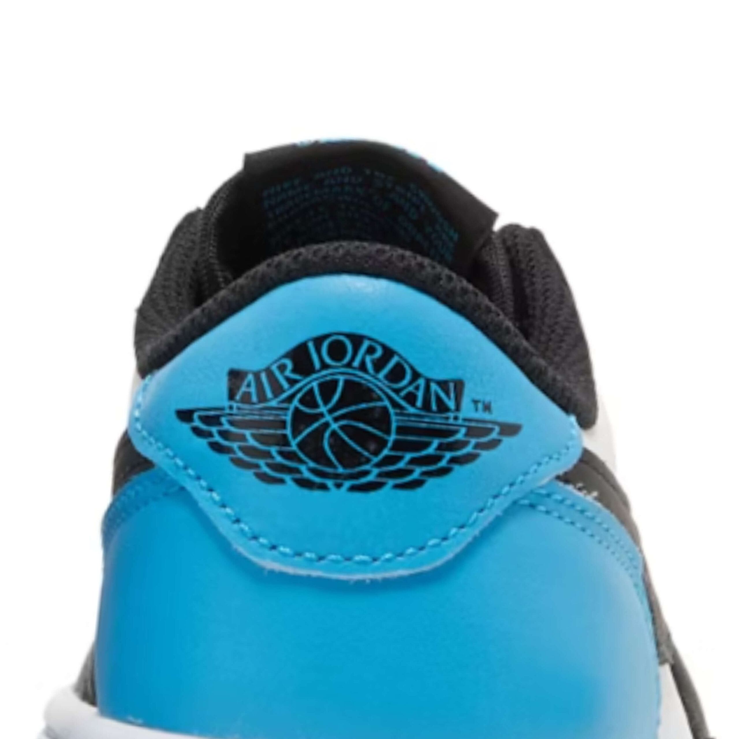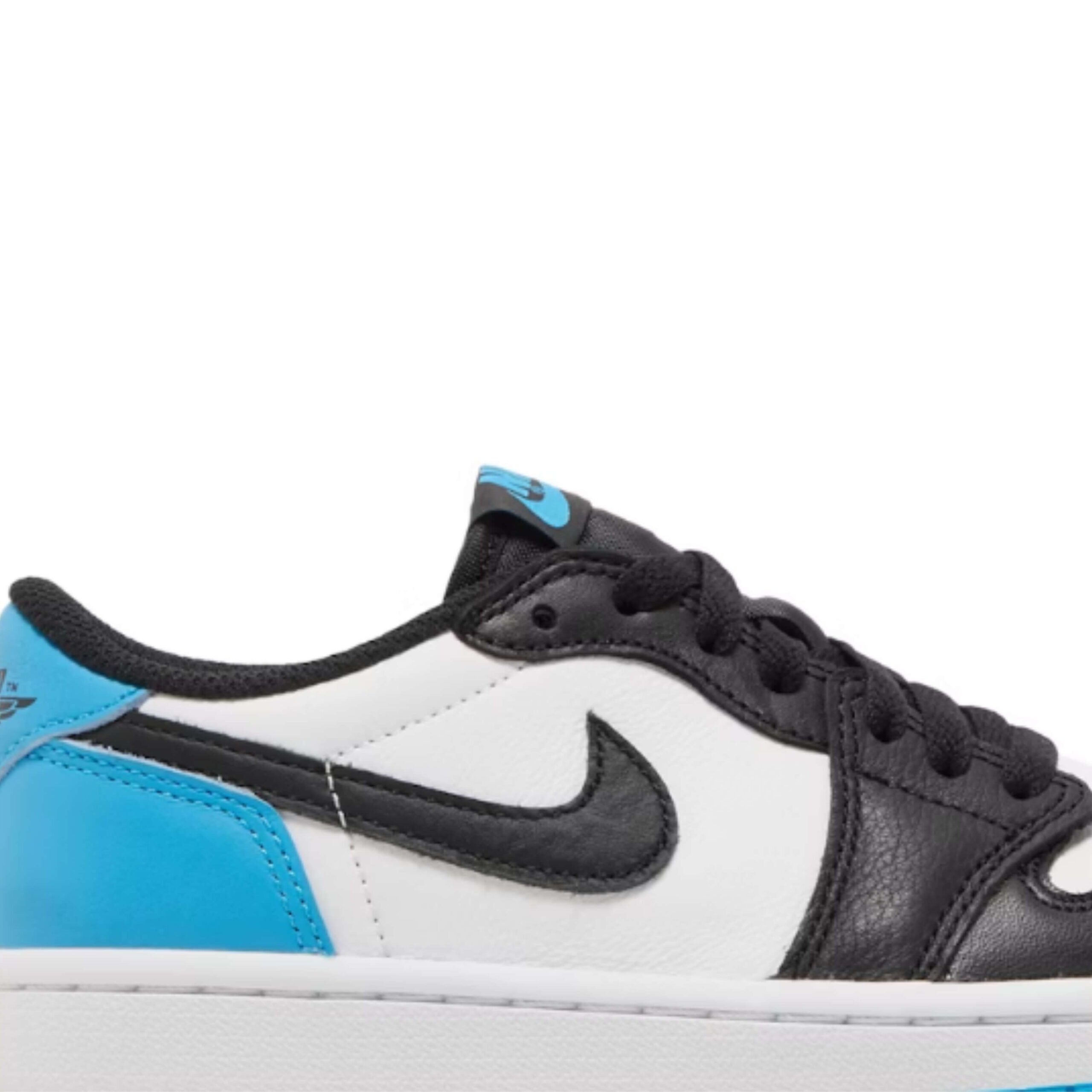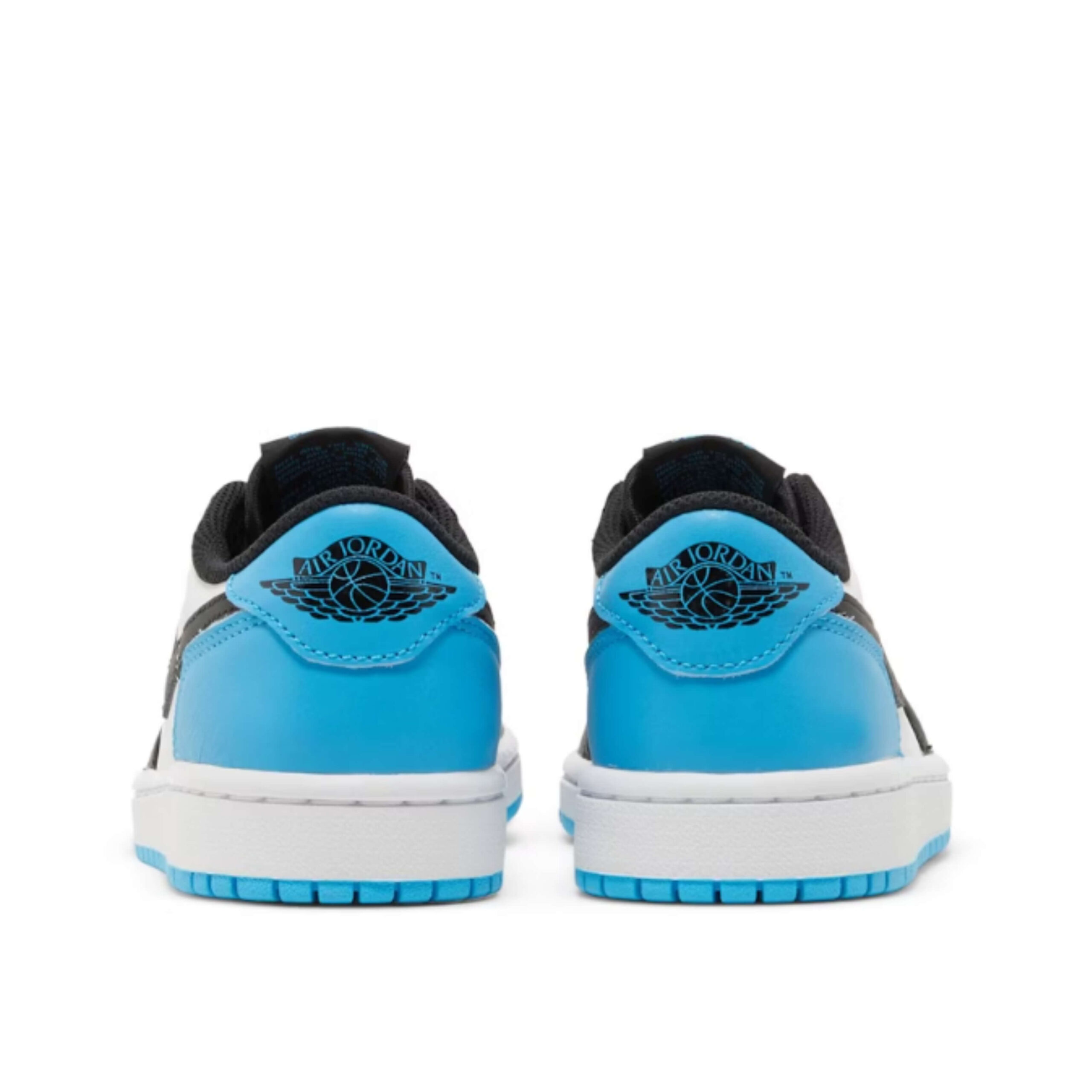 The Air Jordan 1 Retro Low OG UNC arrives with a white leather upper with contrasting black overlays and a University blue Swoosh. This sneaker comes in a combination of white, dark powder blue, and black hues.