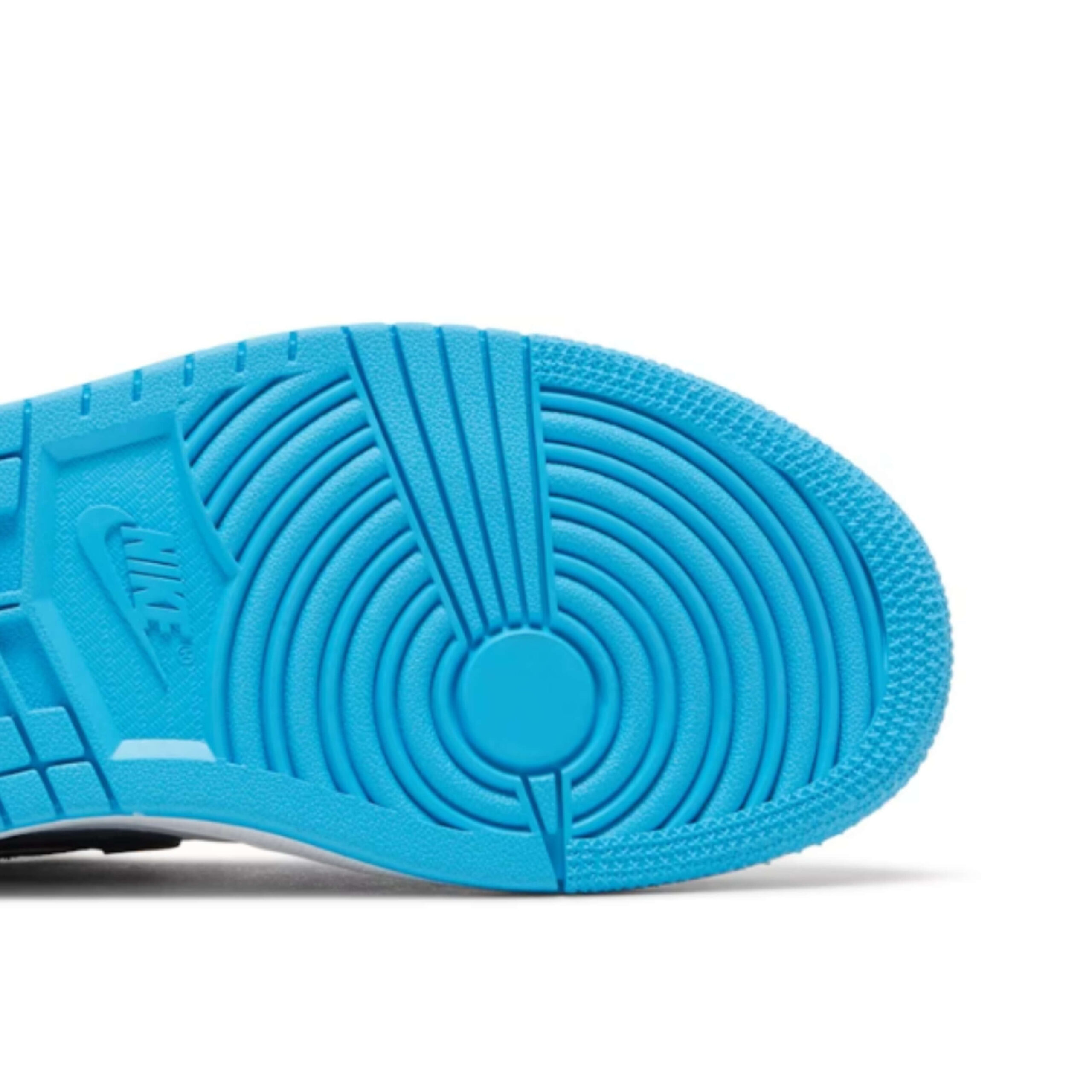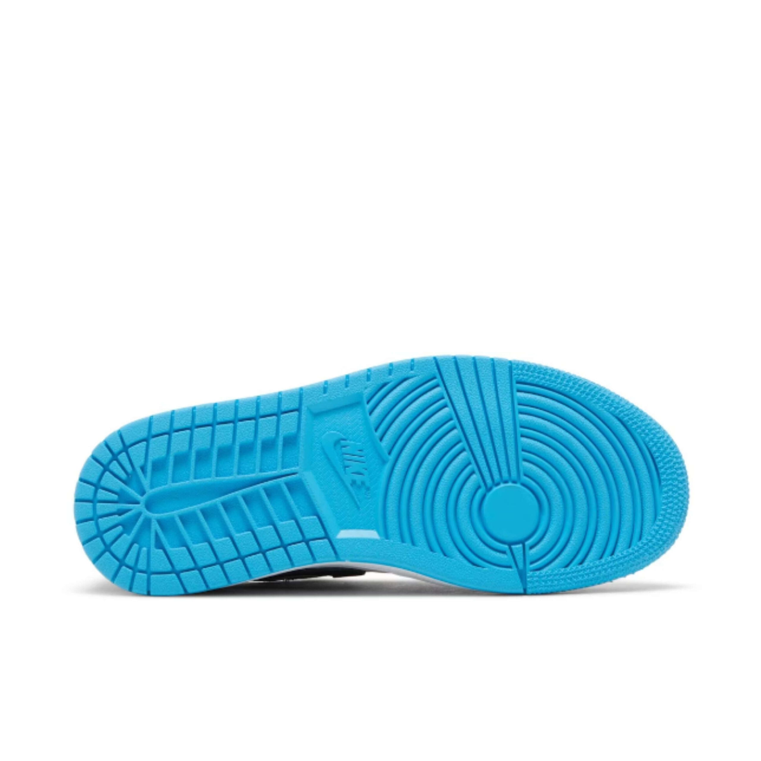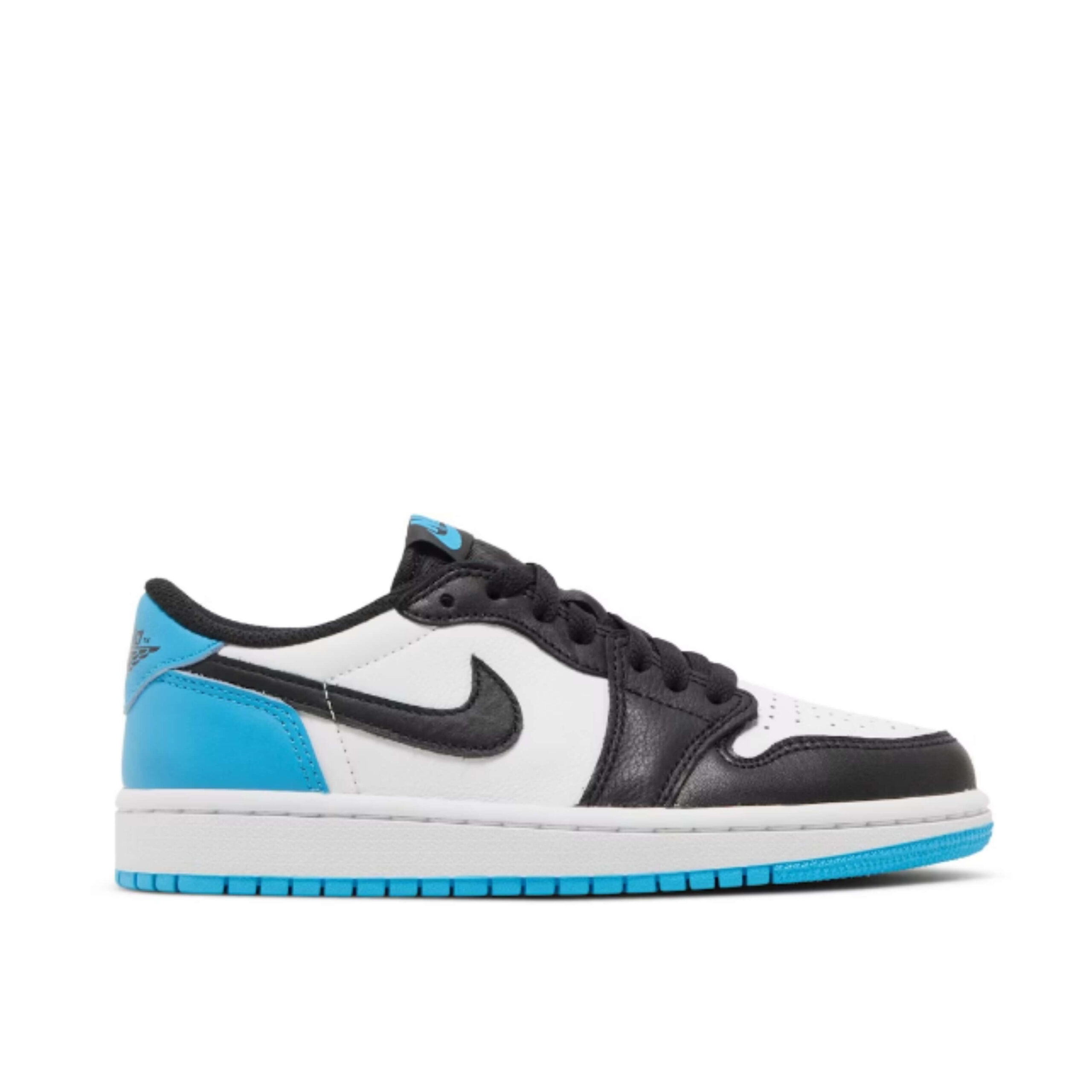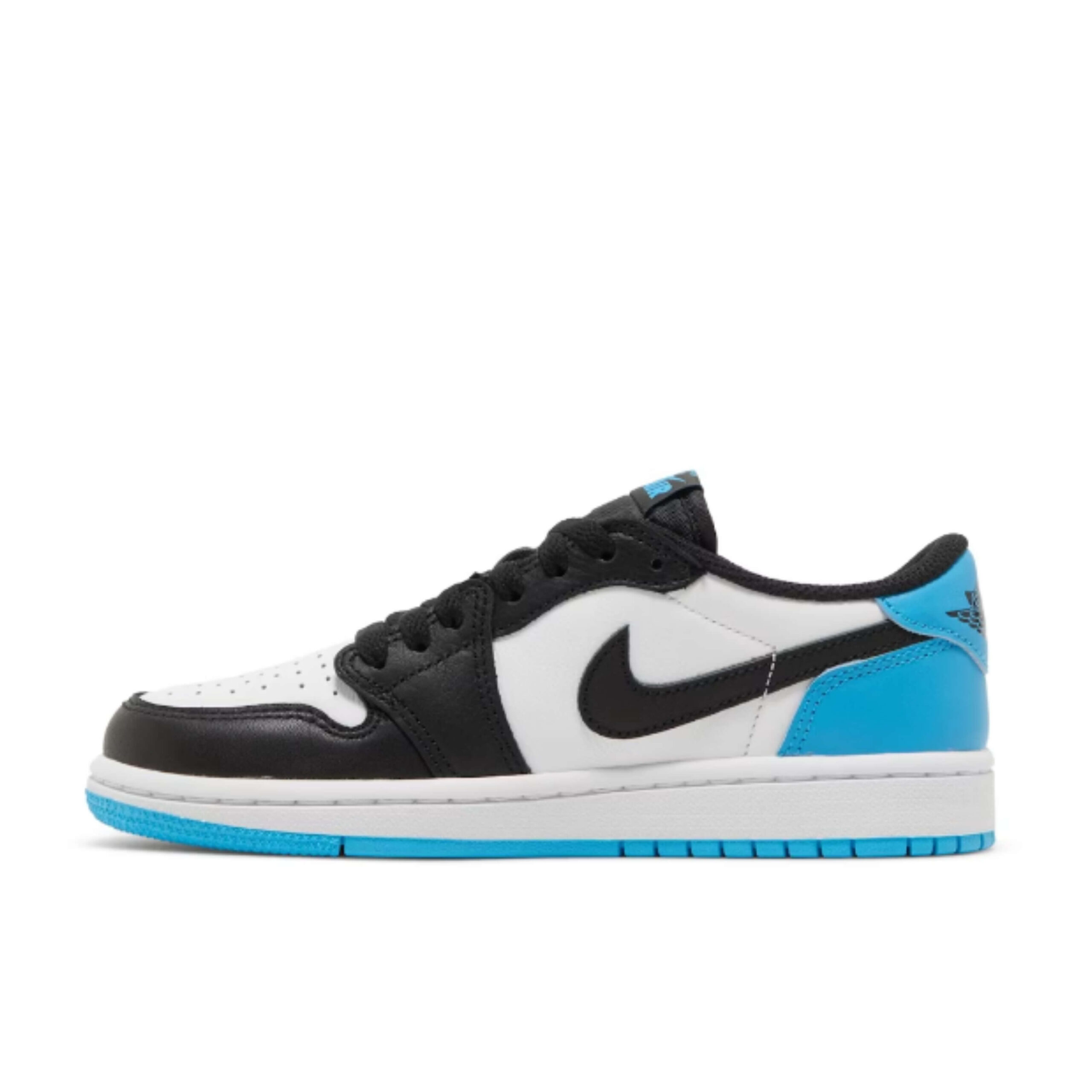 The Air Jordan 1 Retro Low OG UNC arrives with a white leather upper with contrasting black overlays and a University blue Swoosh. This sneaker comes in a combination of white, dark powder blue, and black hues.