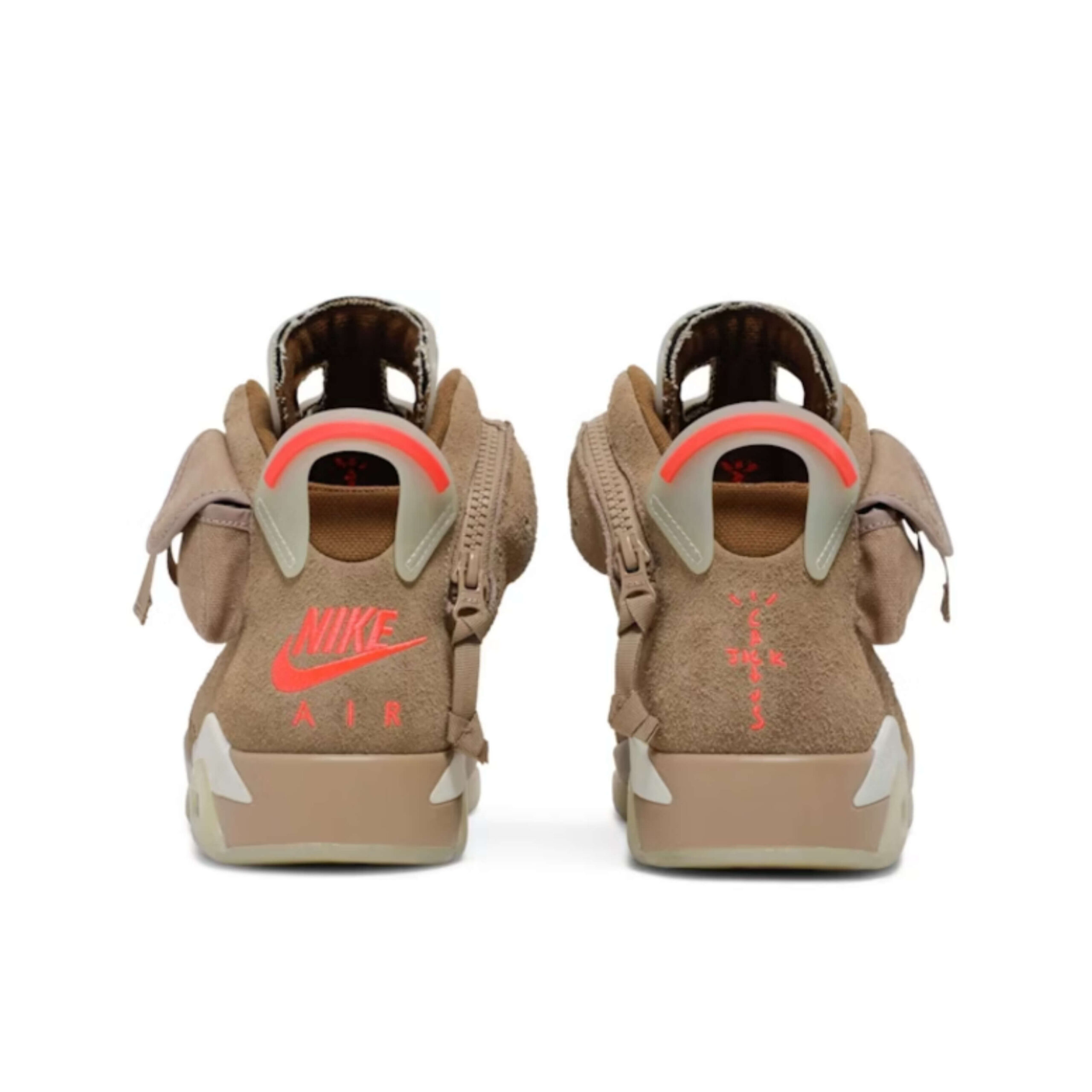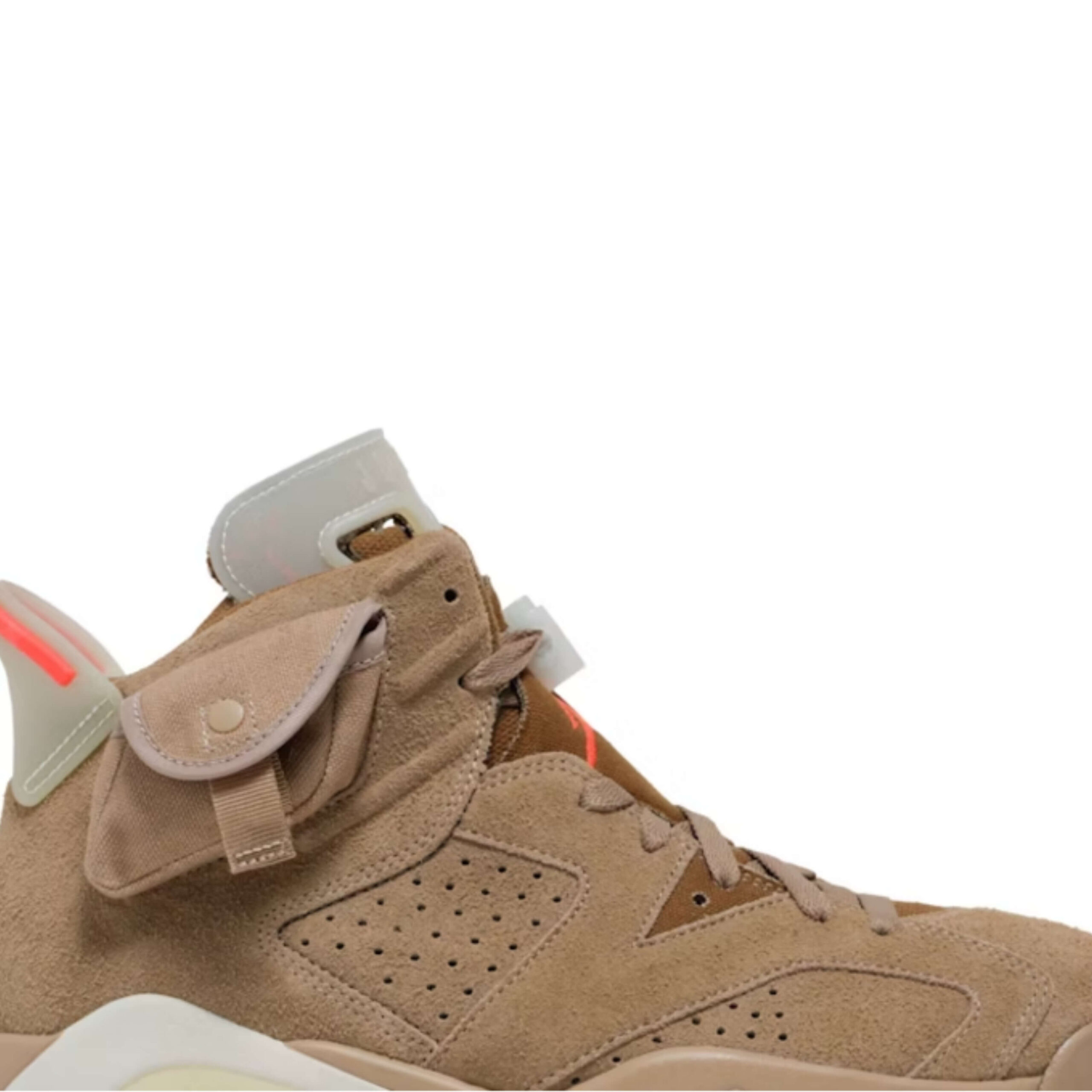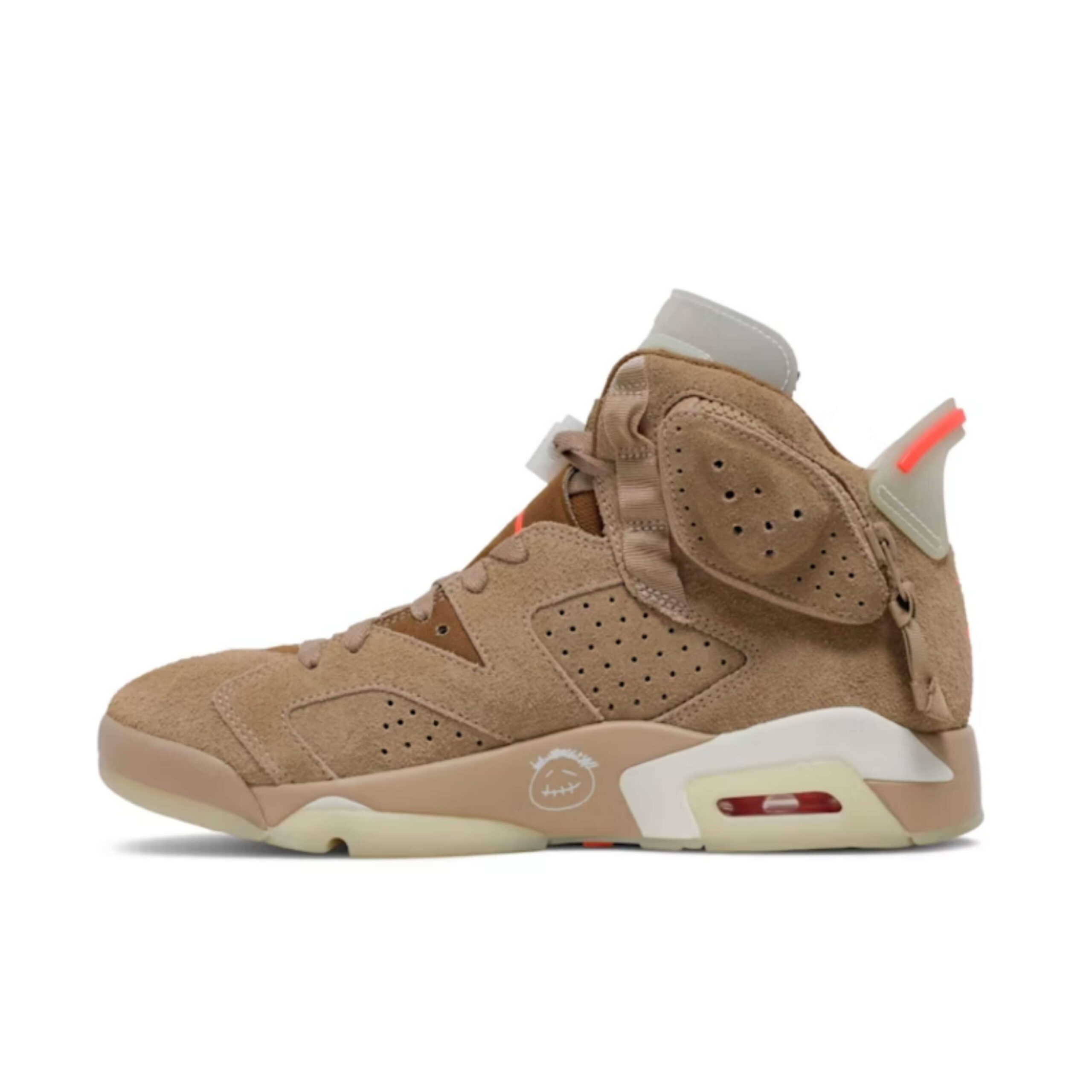 The upper of the Air Jordan 6 Retro Travis Scott British Khaki is made of British Khaki suede. From there, hits of Bright Crimson appear on the heel and tongue embroidered logos. The upper also has two cargo pockets: one with a snap enclosure on the lateral ankle and one with a zip enclosure on the medial ankle. A translucent tongue, heel tab, and outsole that glows in the dark adds the finishing touches to this latest Travis Scott Jordan.