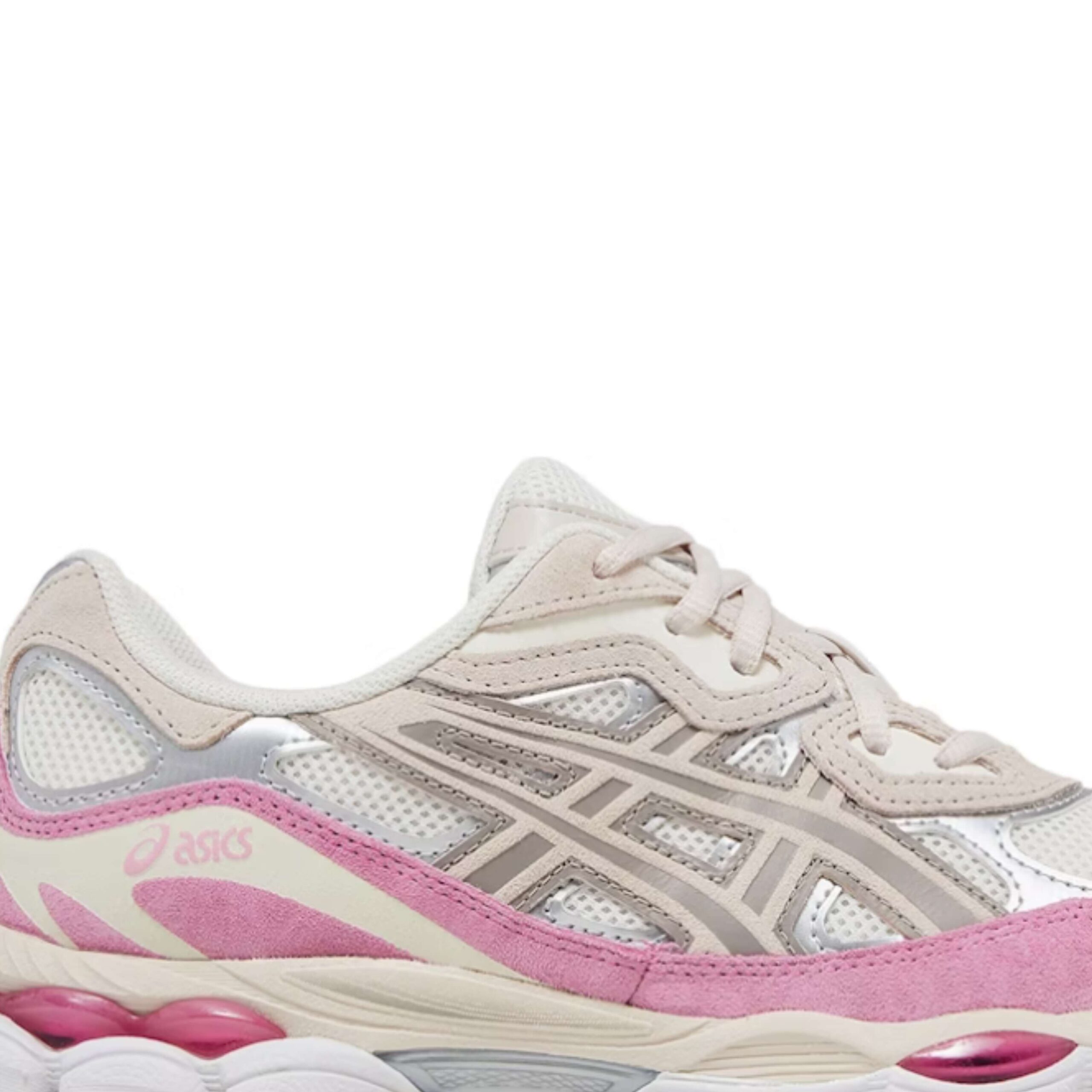 The upper construction of the Cream Mineral Beige Pink ASICS Gel-NYC features breathable mesh with a medium-sized weave in cream and a grid of suede and leather overlays in Mineral Beige and metallic silver across the side panels. Although the upper takes elements from the Gel-Nimbus 3, the midsole combines advanced underfoot technology from the Gel-Cumulus 16. The use of gel inserts in the rear and forefoot as well as a combination of foams creates a responsive feel and protects against impact stress.