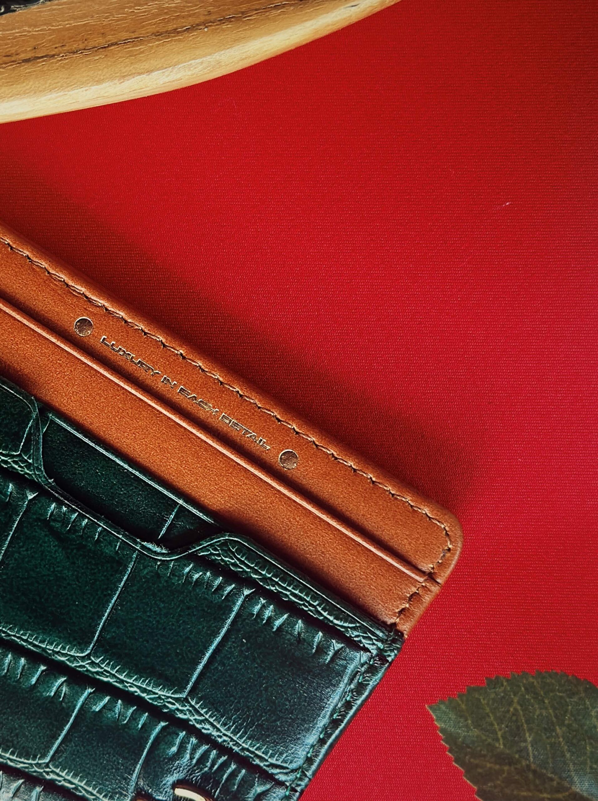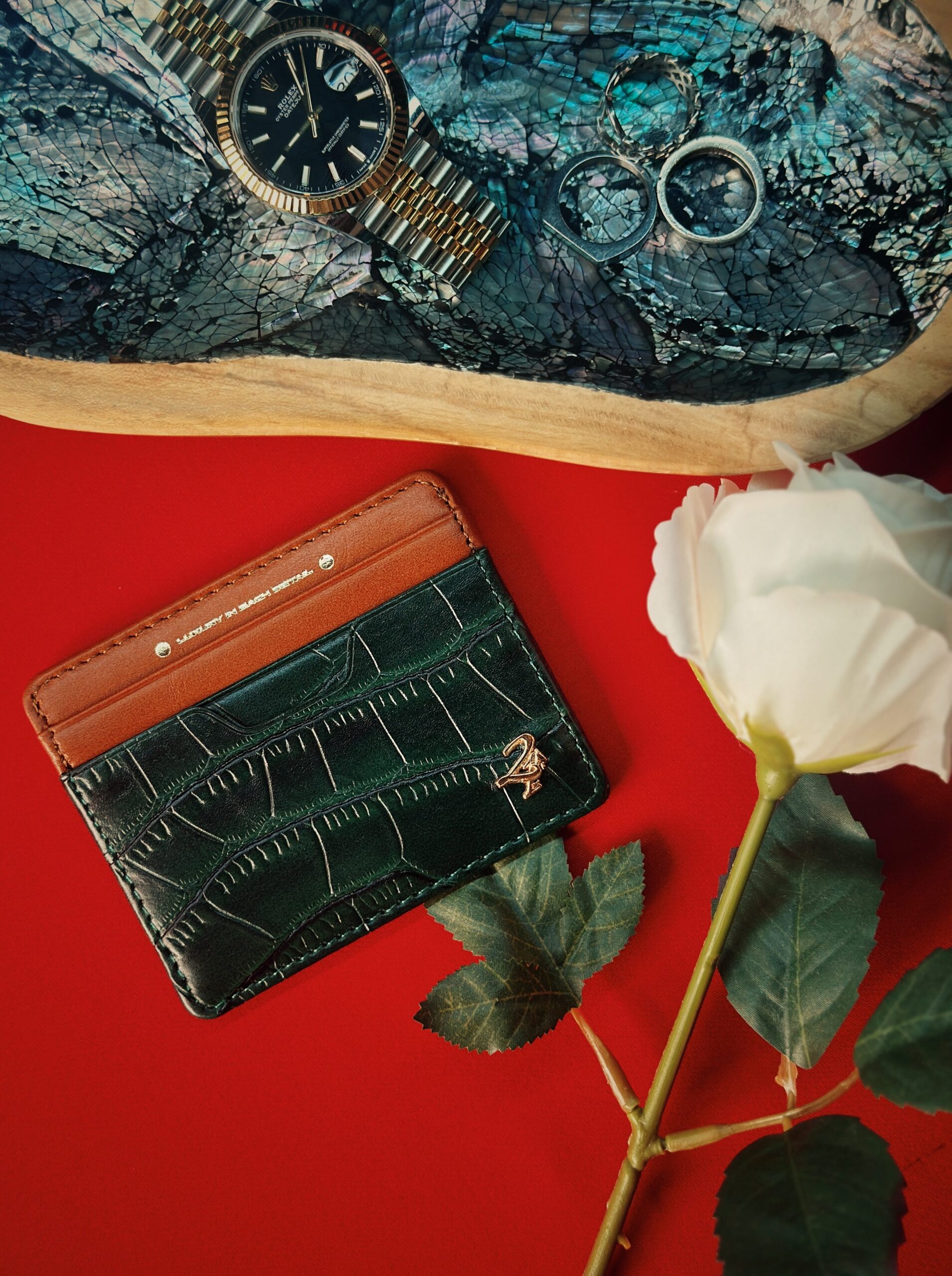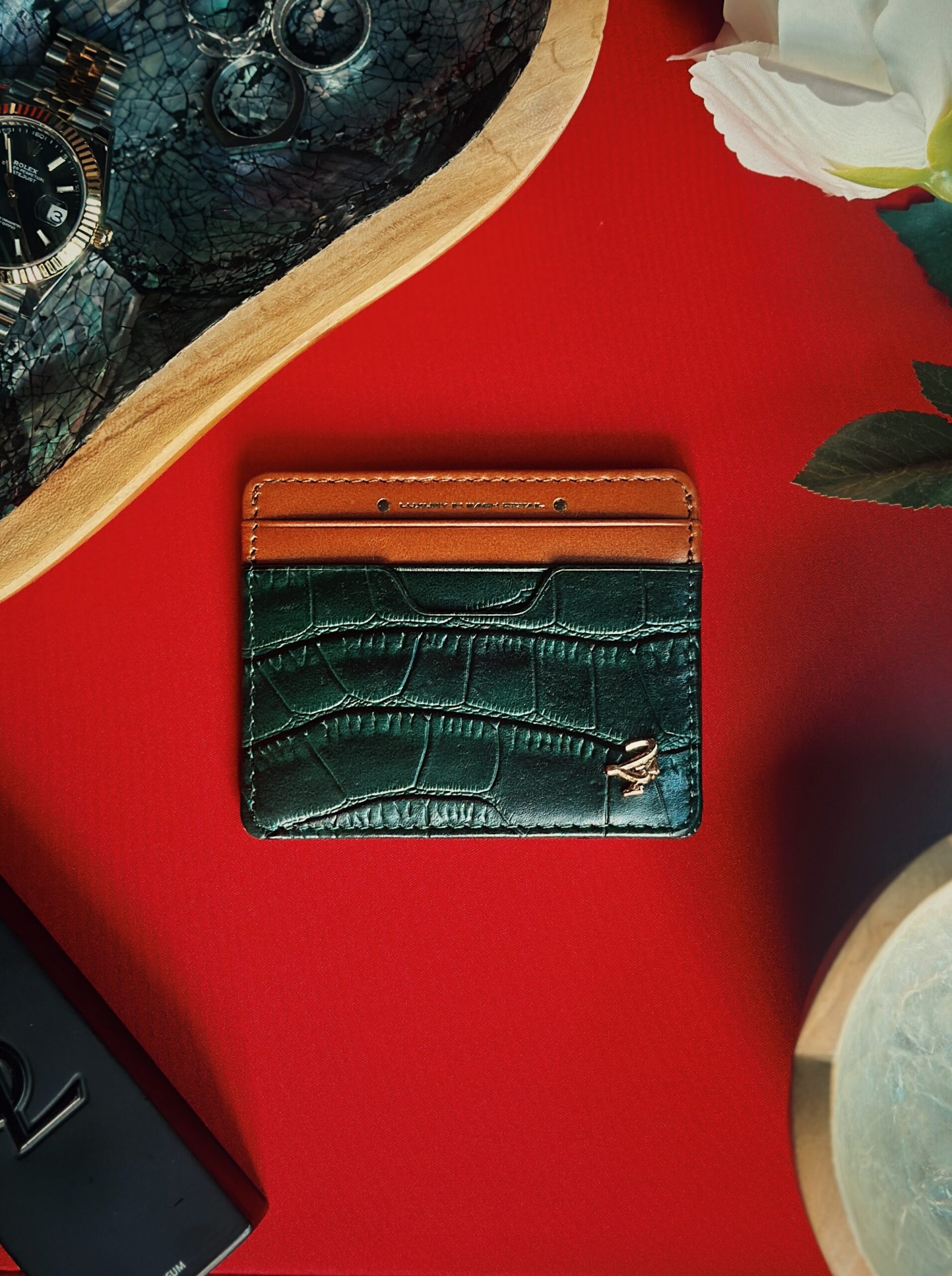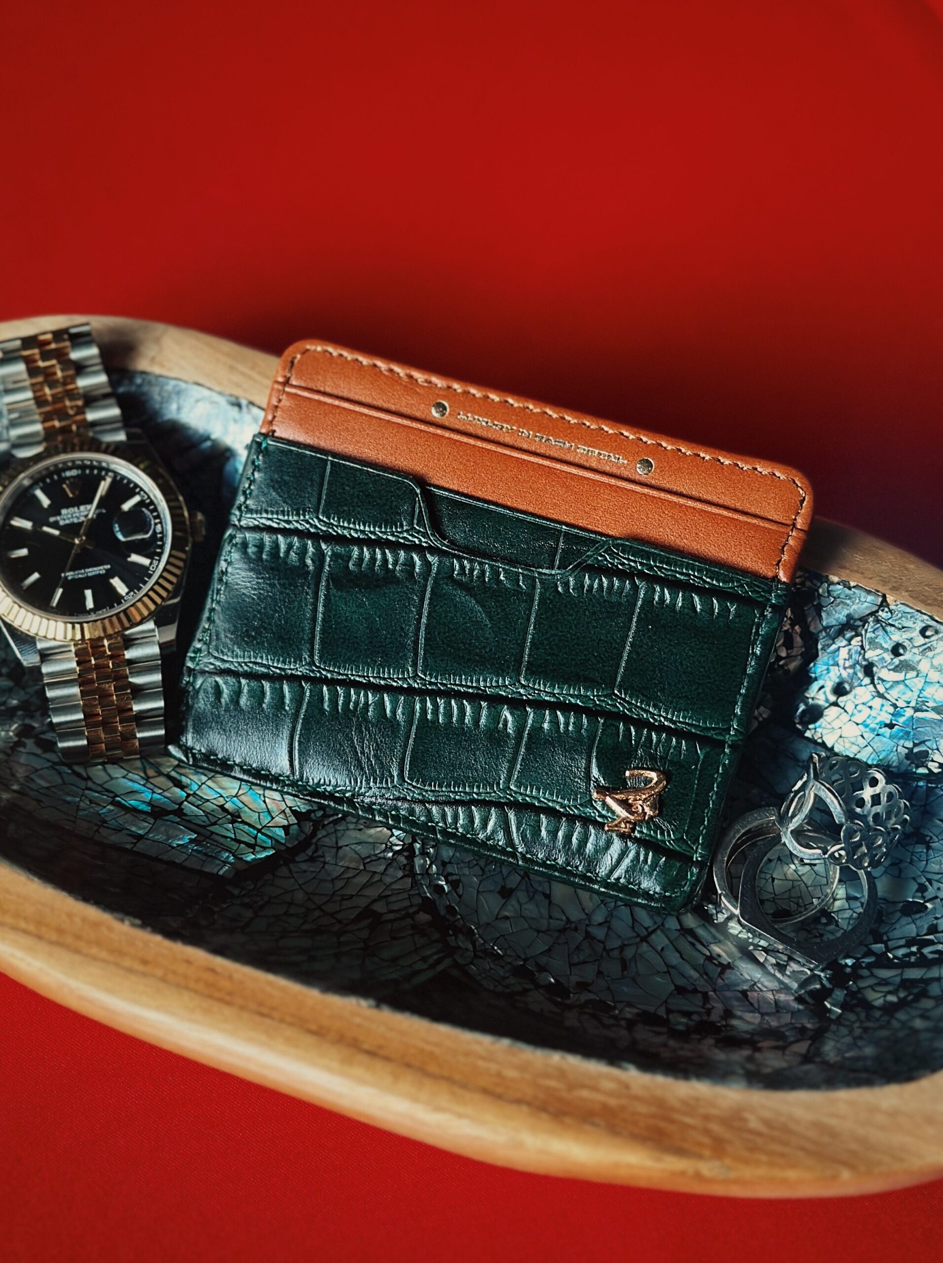 The Emerald Walnut card holder captures the essence of modern luxury — elegant, sleek, and unmistakably refined. Its rich emerald tone layered with warm walnut depth creates a colourway that stands out without ever needing to shout. Smooth to the touch with a premium finish, it brings a polished confidence to every moment you reach for it.