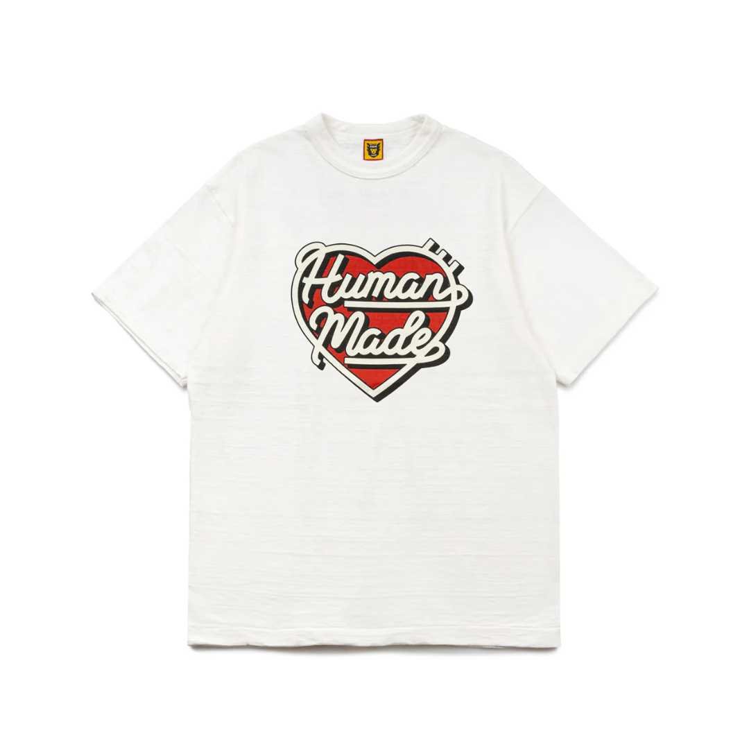 The Human Made Graphic T-Shirt #7 in white is a stylish piece that embodies the brand’s playful and bold aesthetic. Crafted from 100% cotton, this t-shirt offers both comfort and durability. It features a classic crewneck design with short sleeves and a straight hem. The standout element is the heart-shaped logo prominently displayed across the chest, adding a touch of whimsy to the minimalist white base. Additionally, a smaller heart logo is featured at the rear yoke, enhancing the t-shirt’s unique appeal.