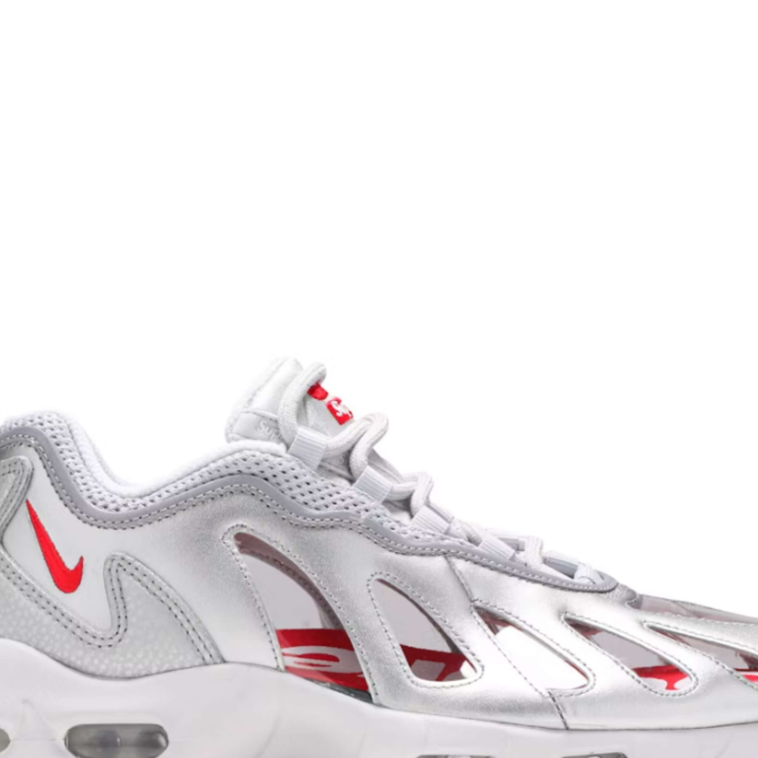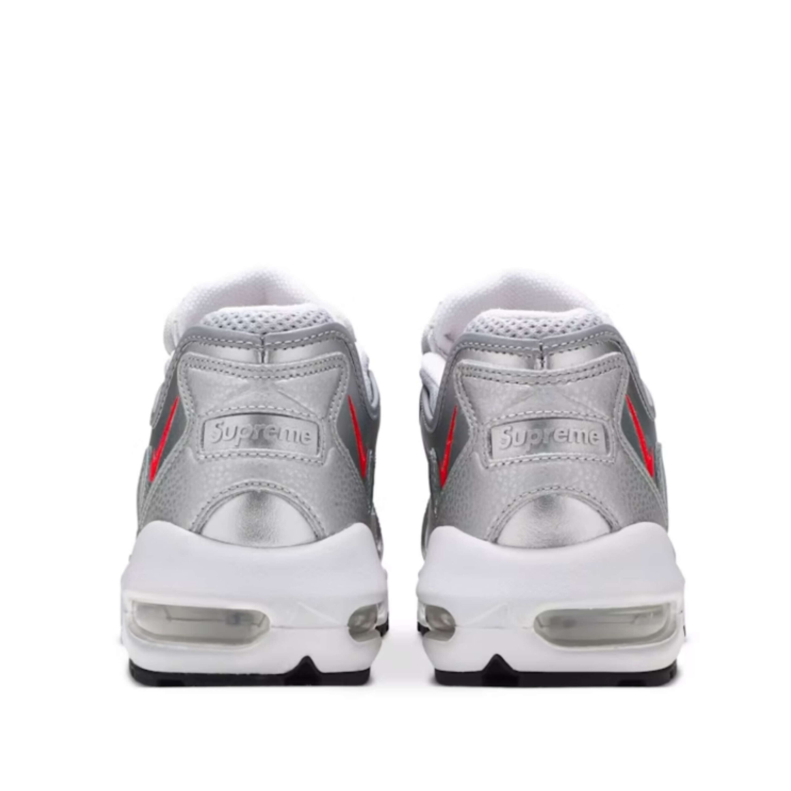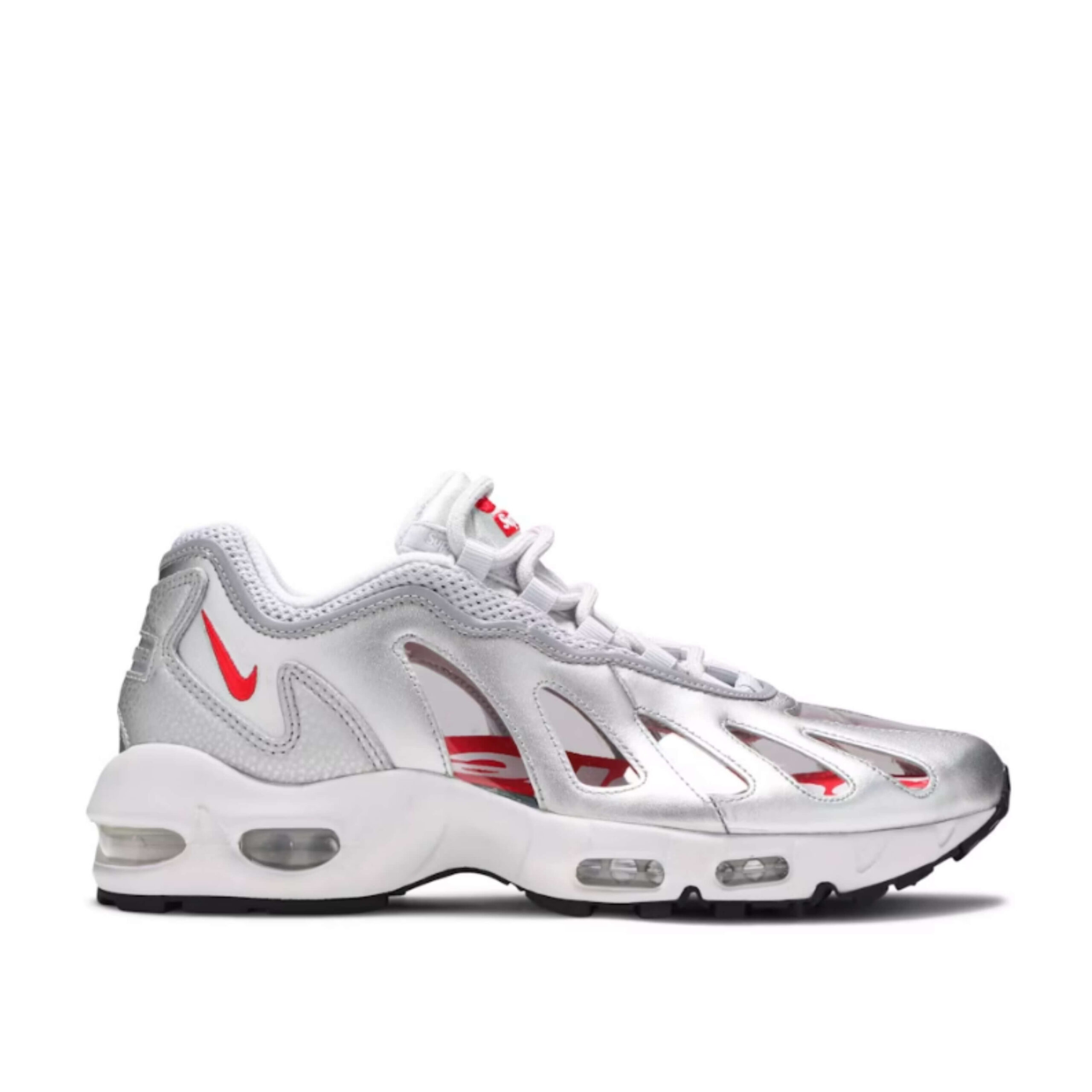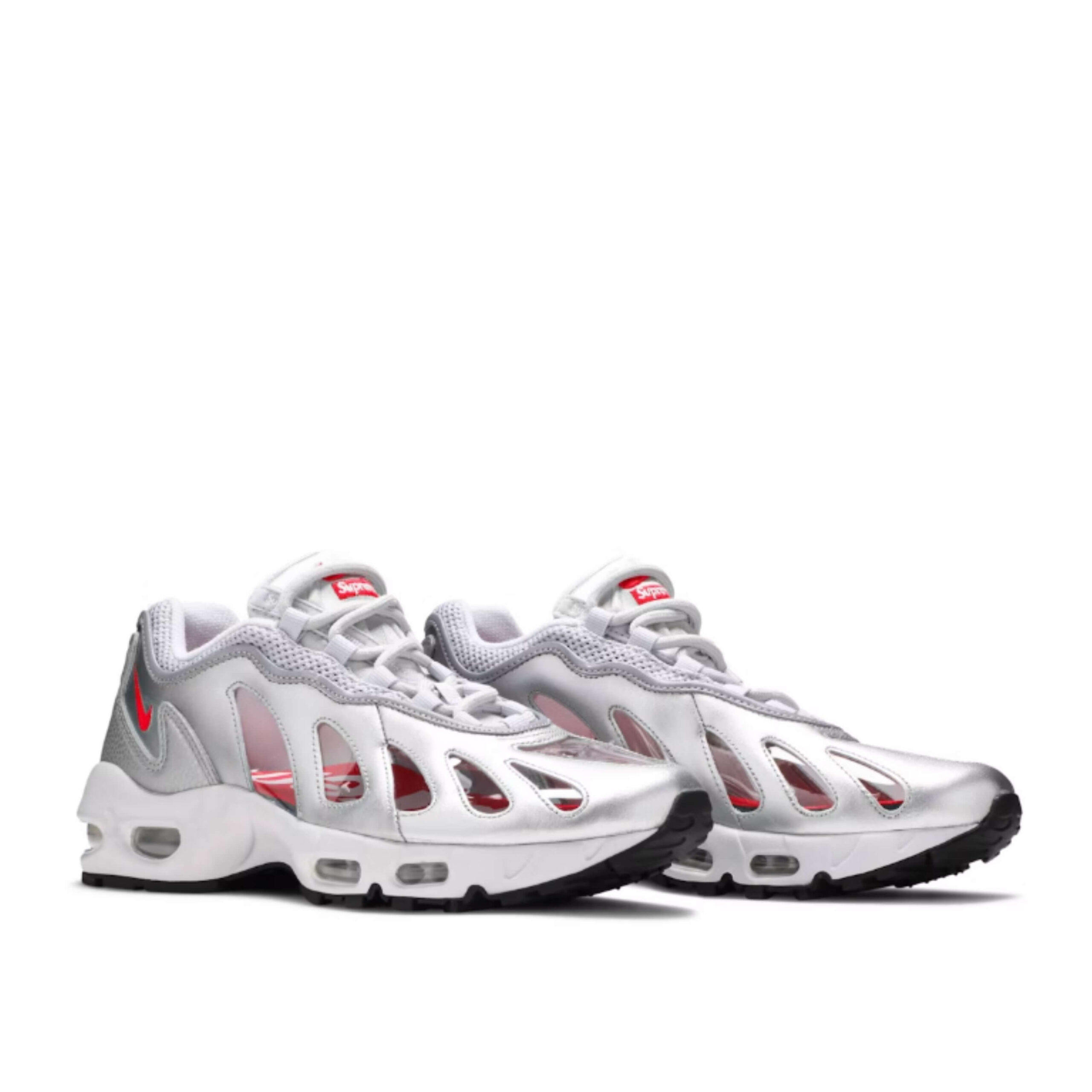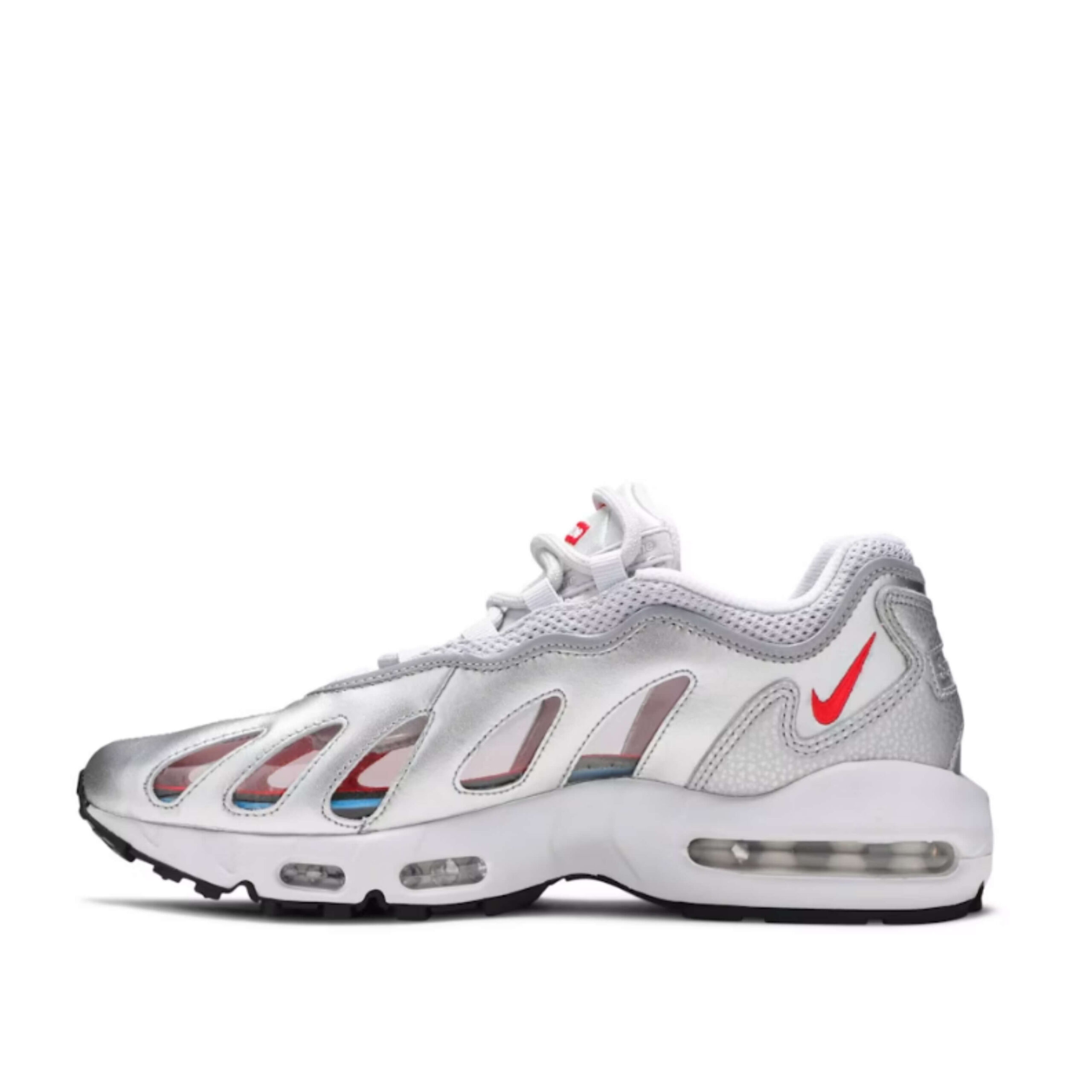 The Nike Air Max 96 Supreme Silver Bullet is part of a collection of Nike Air Max 96 shoes in Speed Red, Metallic Silver, and Clear color scheme.