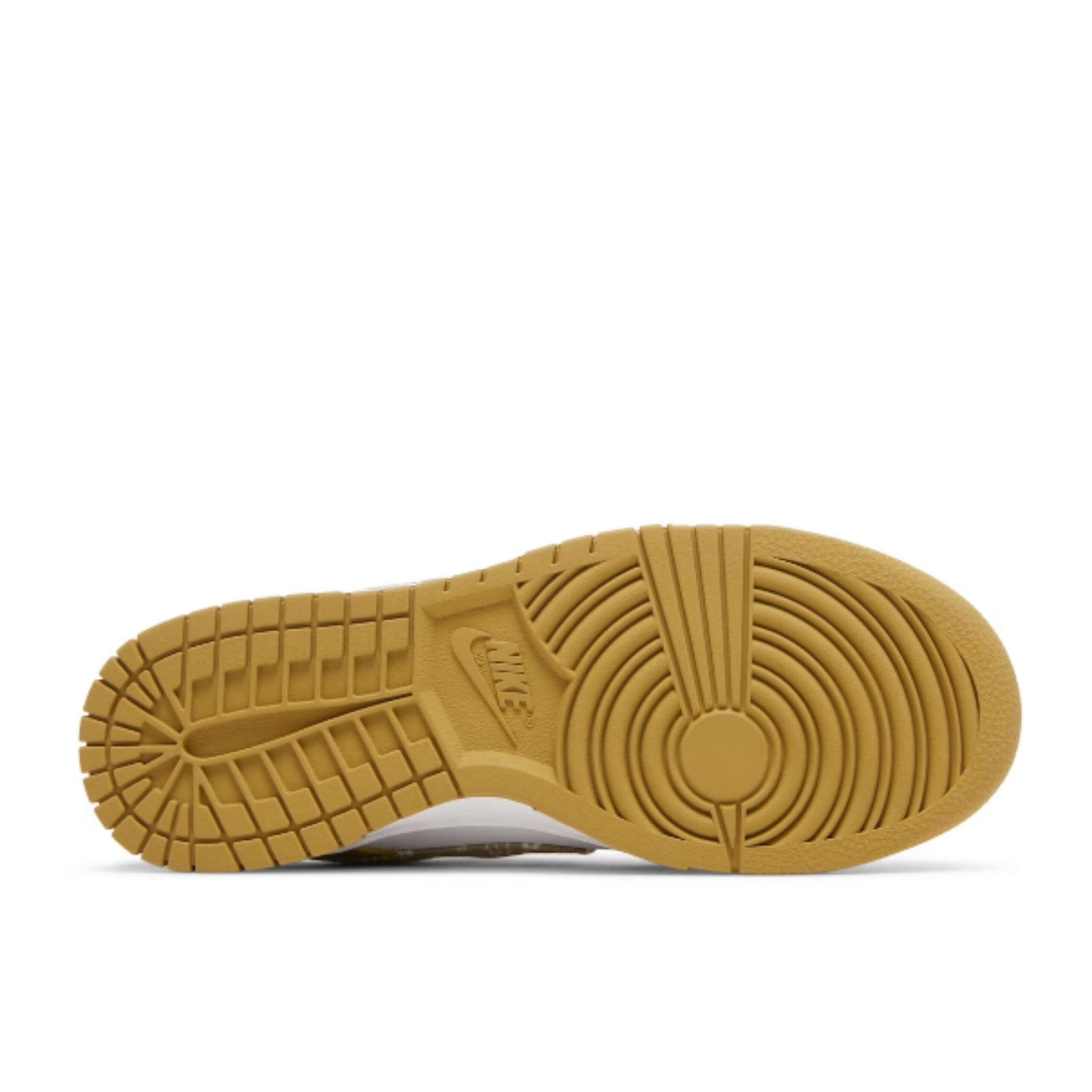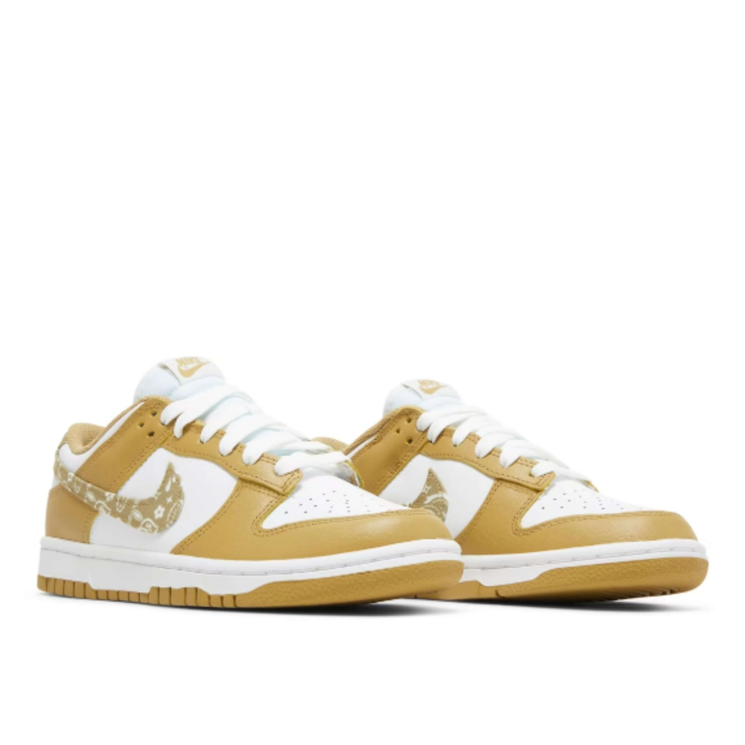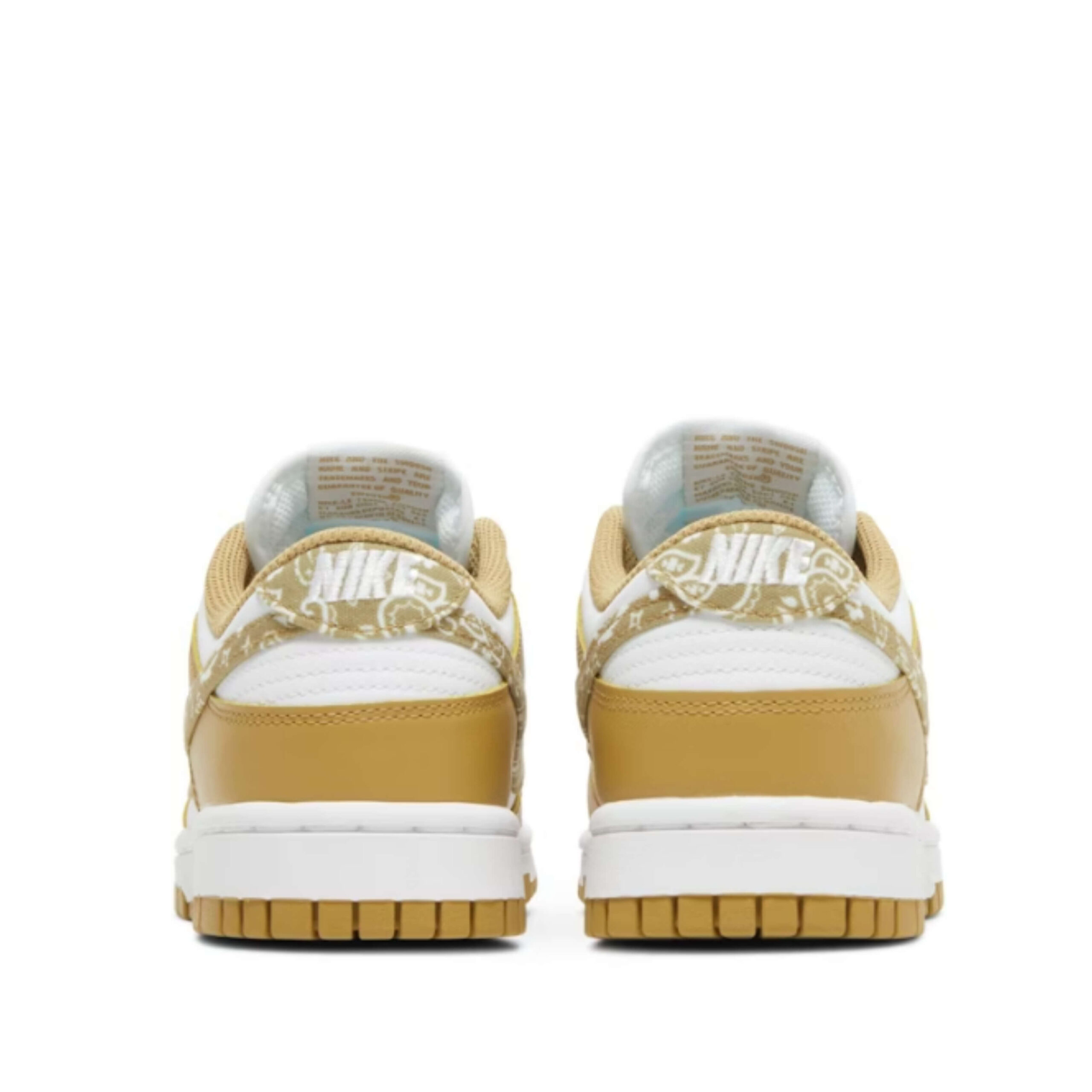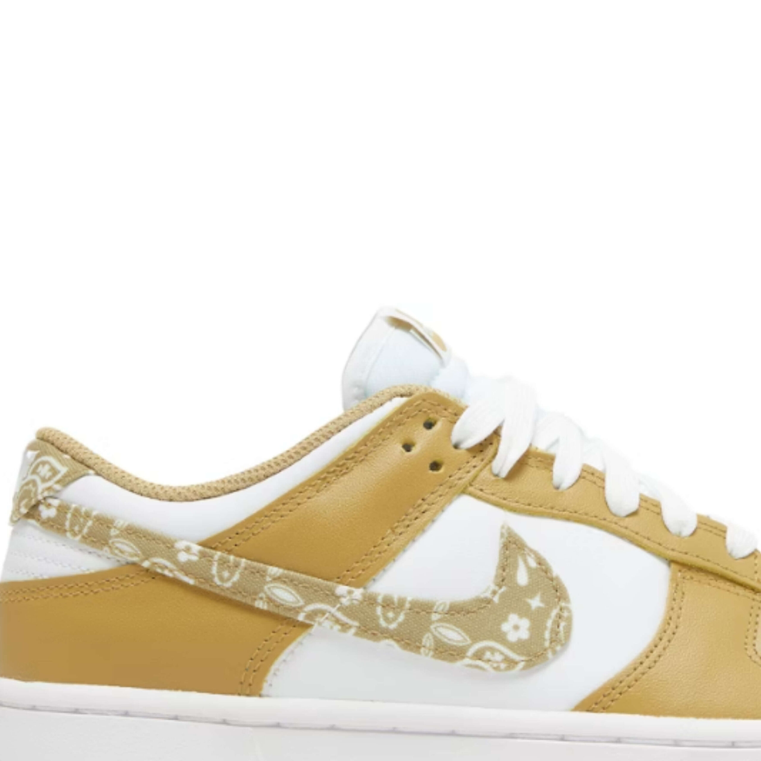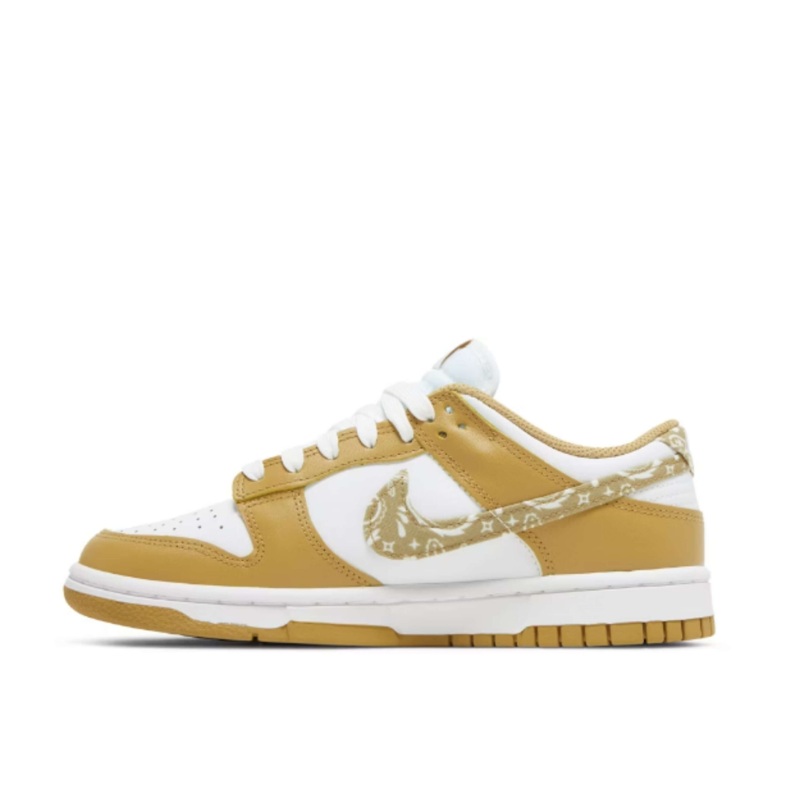 The Nike Dunk Low Essential Paisley Pack Barley also has a white tongue and white shoelaces. The shoe’s logo is printed on the tongue in a barley color.