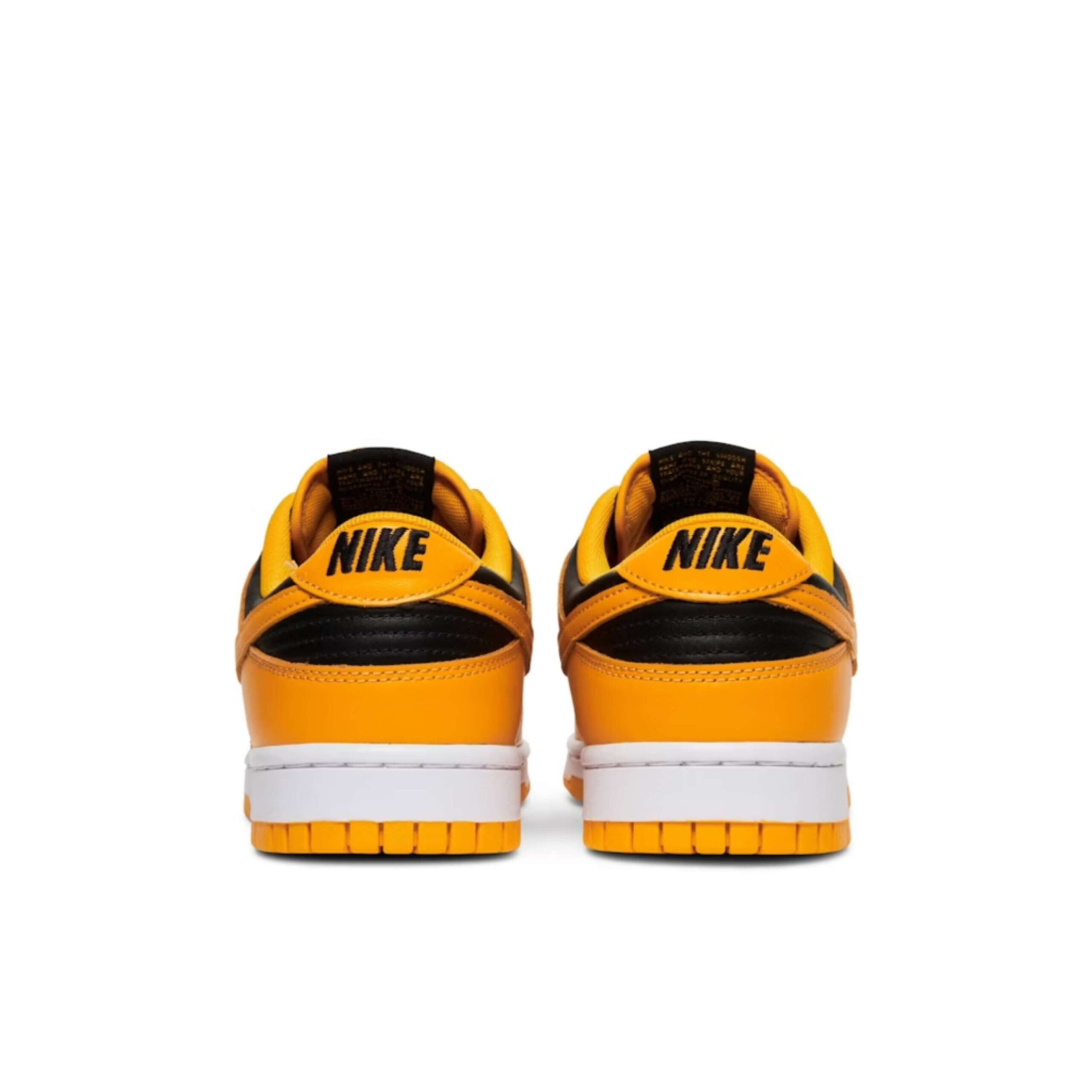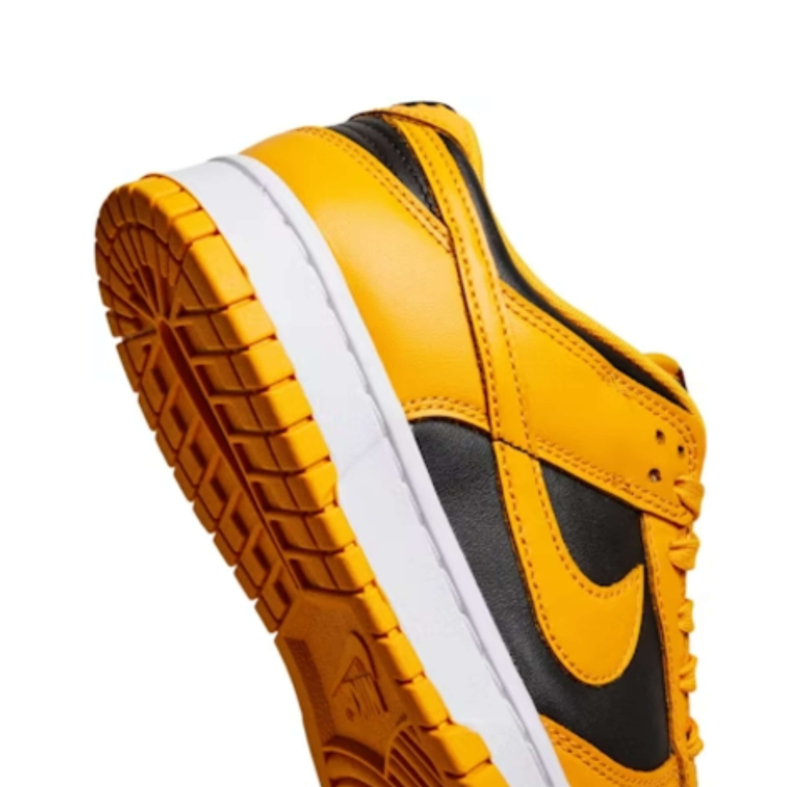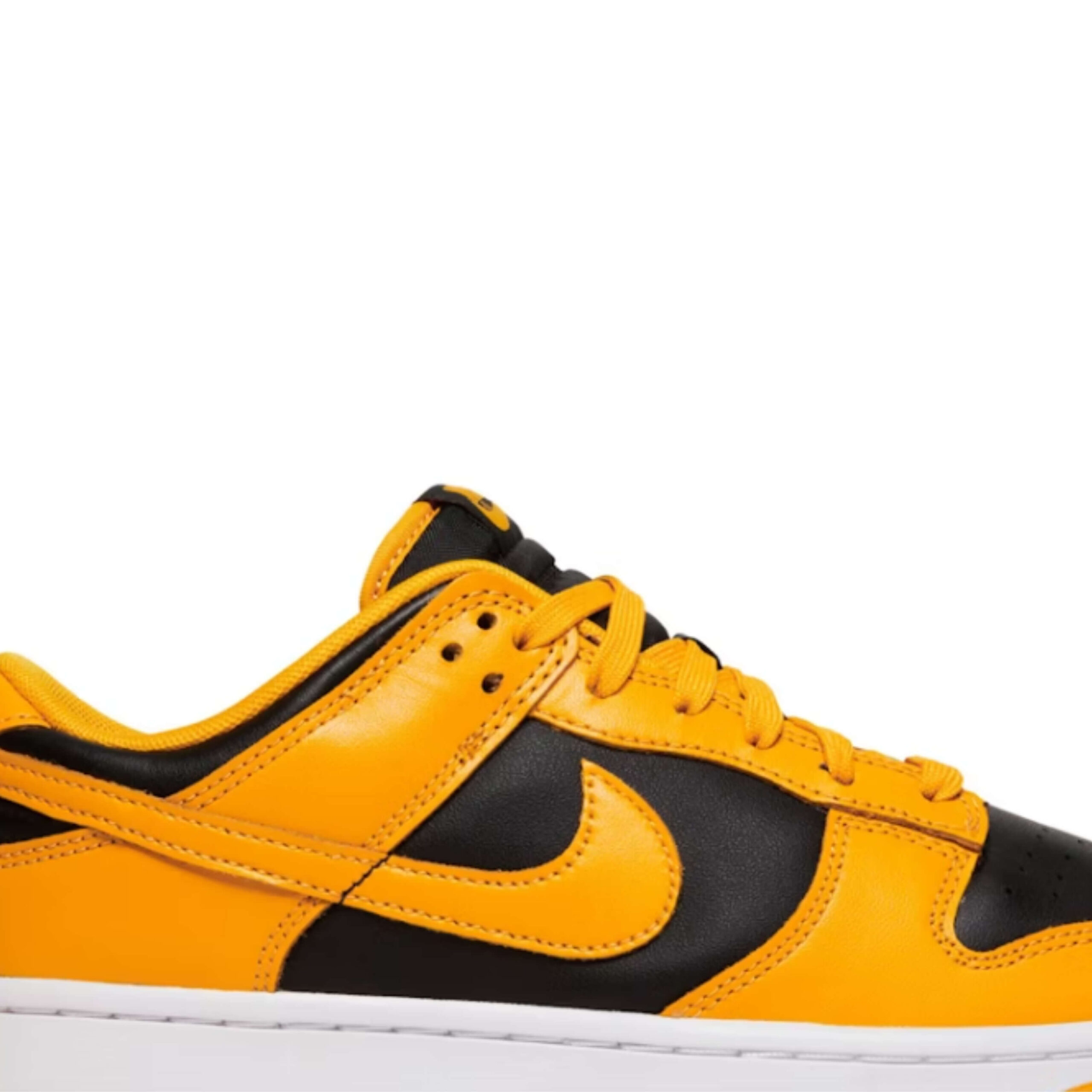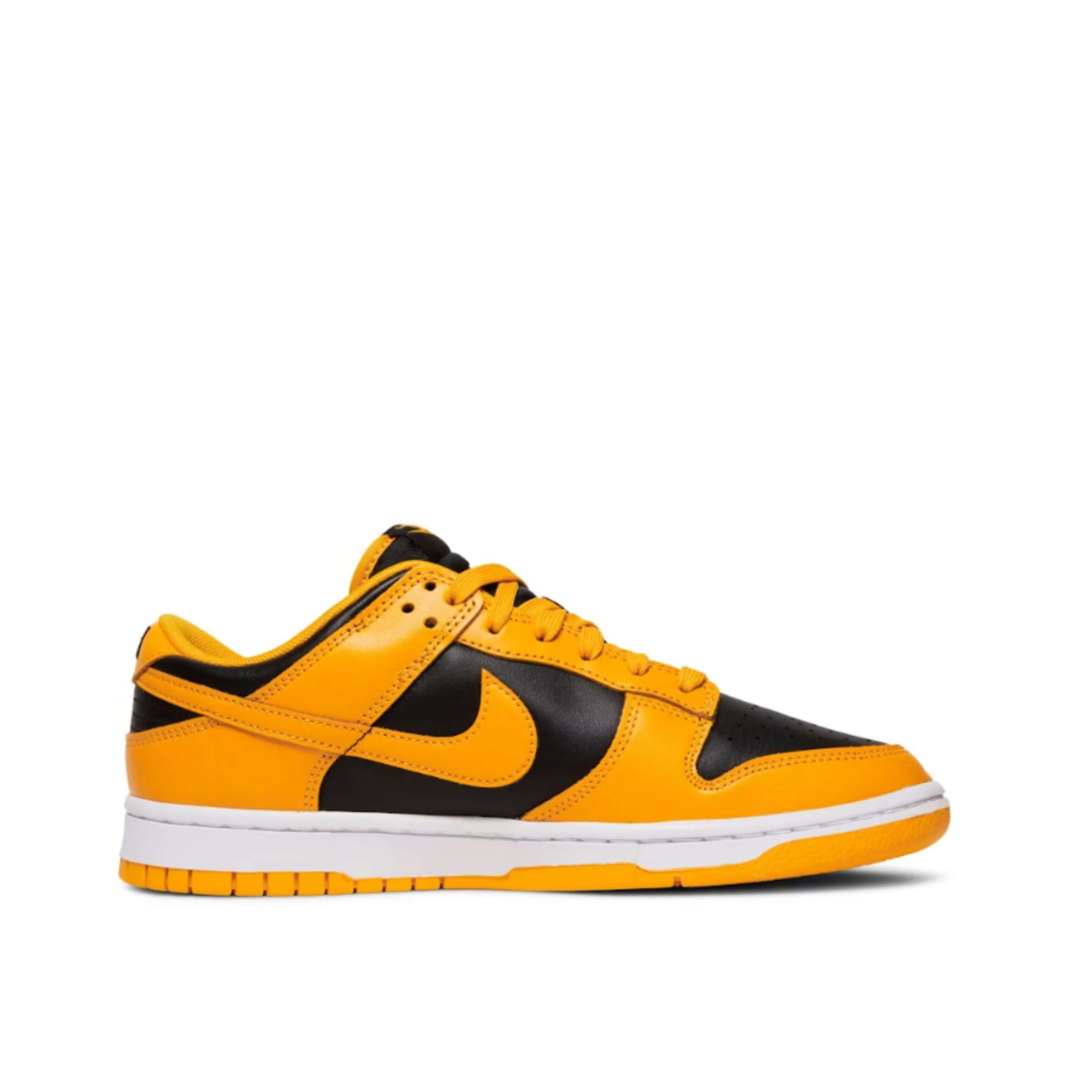 Also known as the Dunk Low Iowa, the Nike Dunk Low Goldenrod features a black leather upper with golden yellow overlays and Swooshes. Classic Nike branding on the tongue label and heel tab deliver a retro feel. At the base, a white and yellow Air sole completes the design.