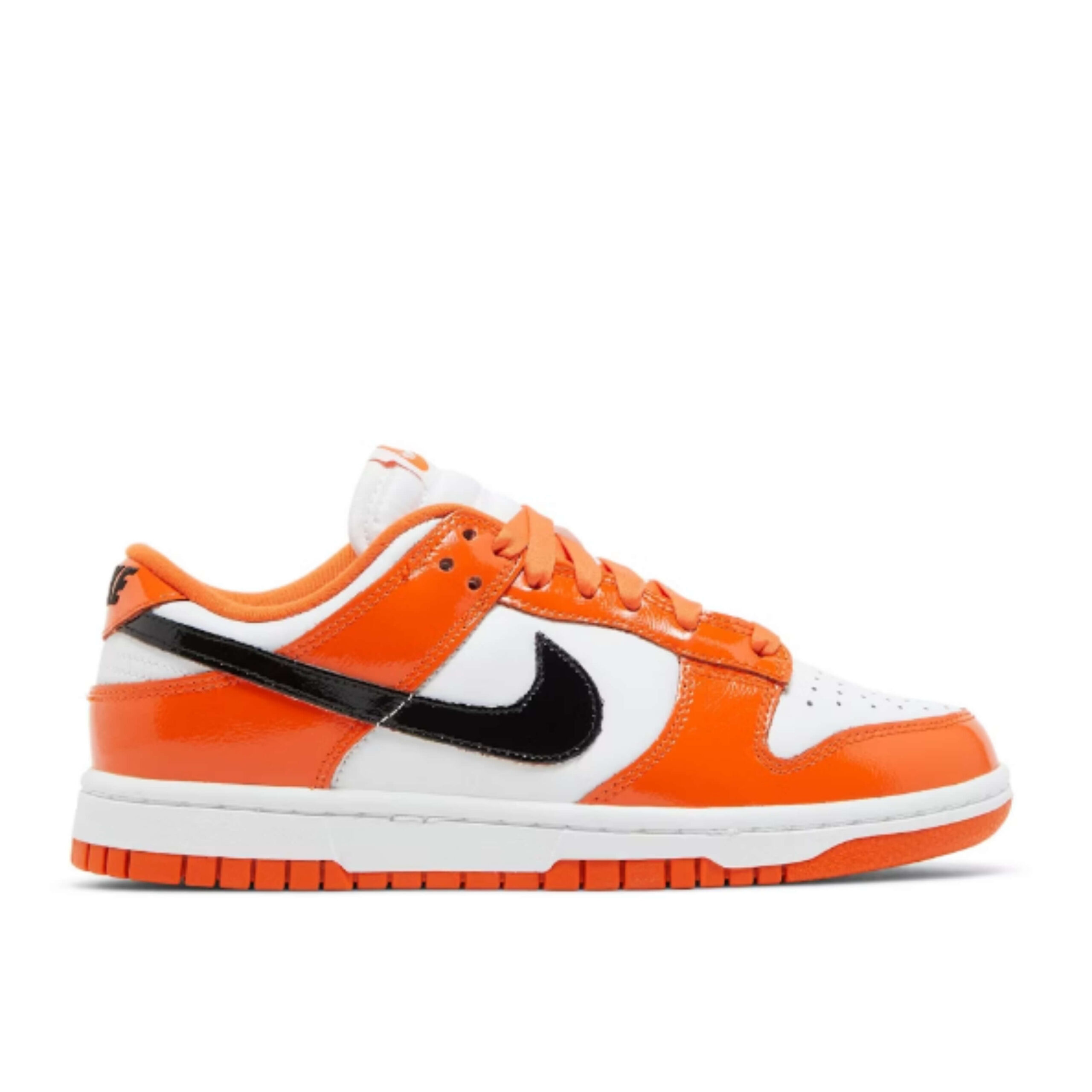 The Nike Dunk Low Patent Halloween W is a Peter Moore design launched in honor of the Halloween season. The Halloween-influenced Dunk Low colorway has both smooth leather and patent option makeover.