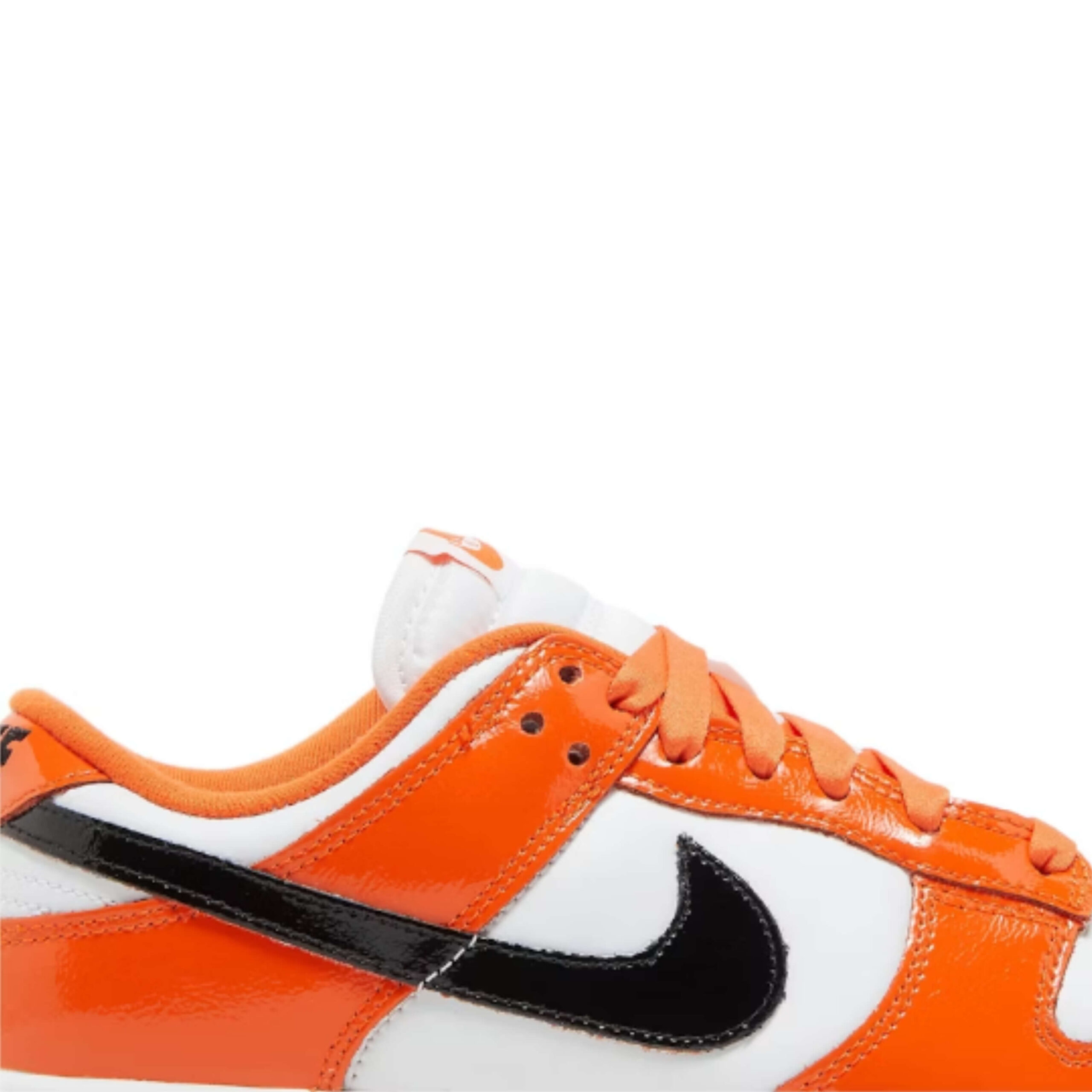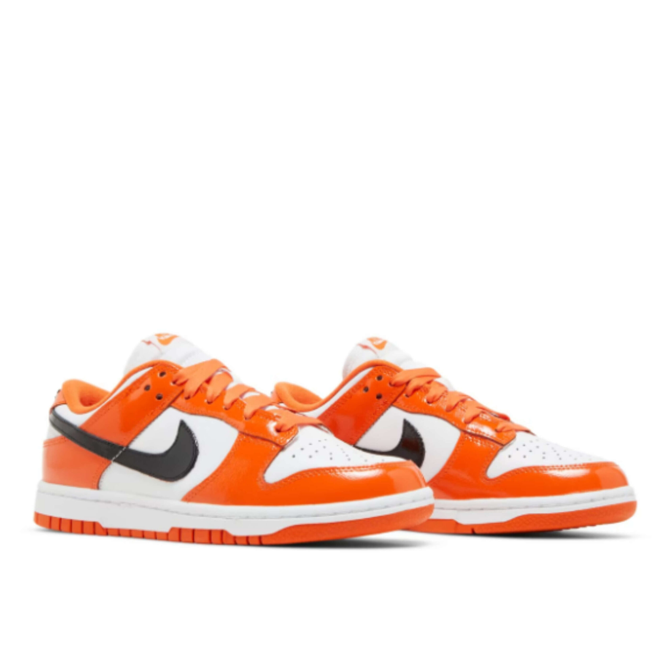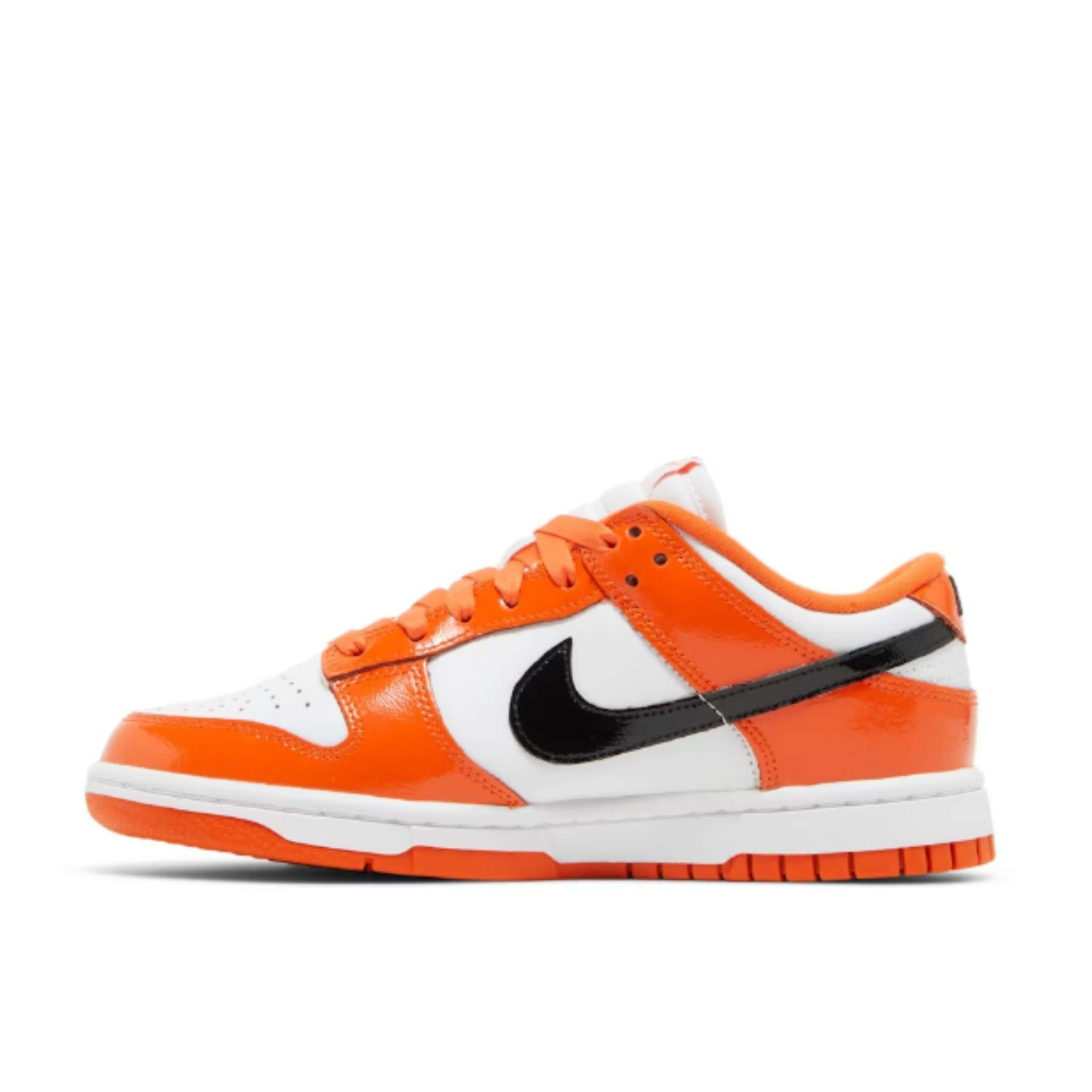 The Nike Dunk Low for women features a white leather base, patent leather overlays, and black Swoosh logos on the shoe sides. The tongue and shoelaces are orange. The shoes have bright orange outsoles underneath and white rubber midsoles which also complete this shoe design.