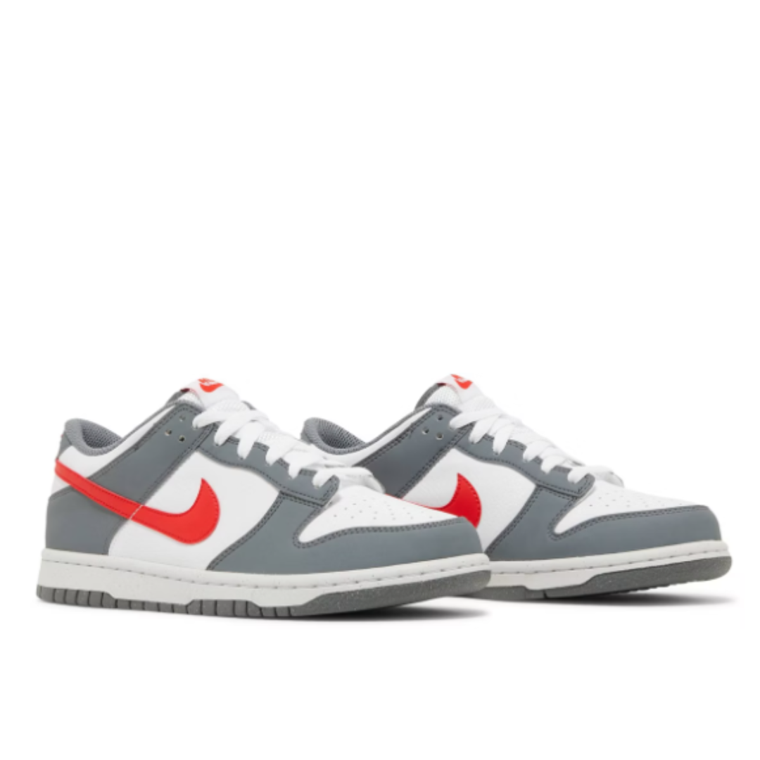 The Nike Dunk Low Next Nature Smoke Grey Light Crimson (GS) takes a classic silhouette, constructs it in an environmentally responsible manner with 20% recycled material, dresses it in a contrasting colorway that pops, and sizes it for grade school kids.