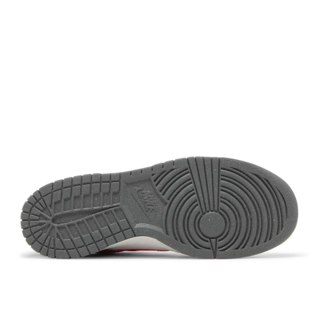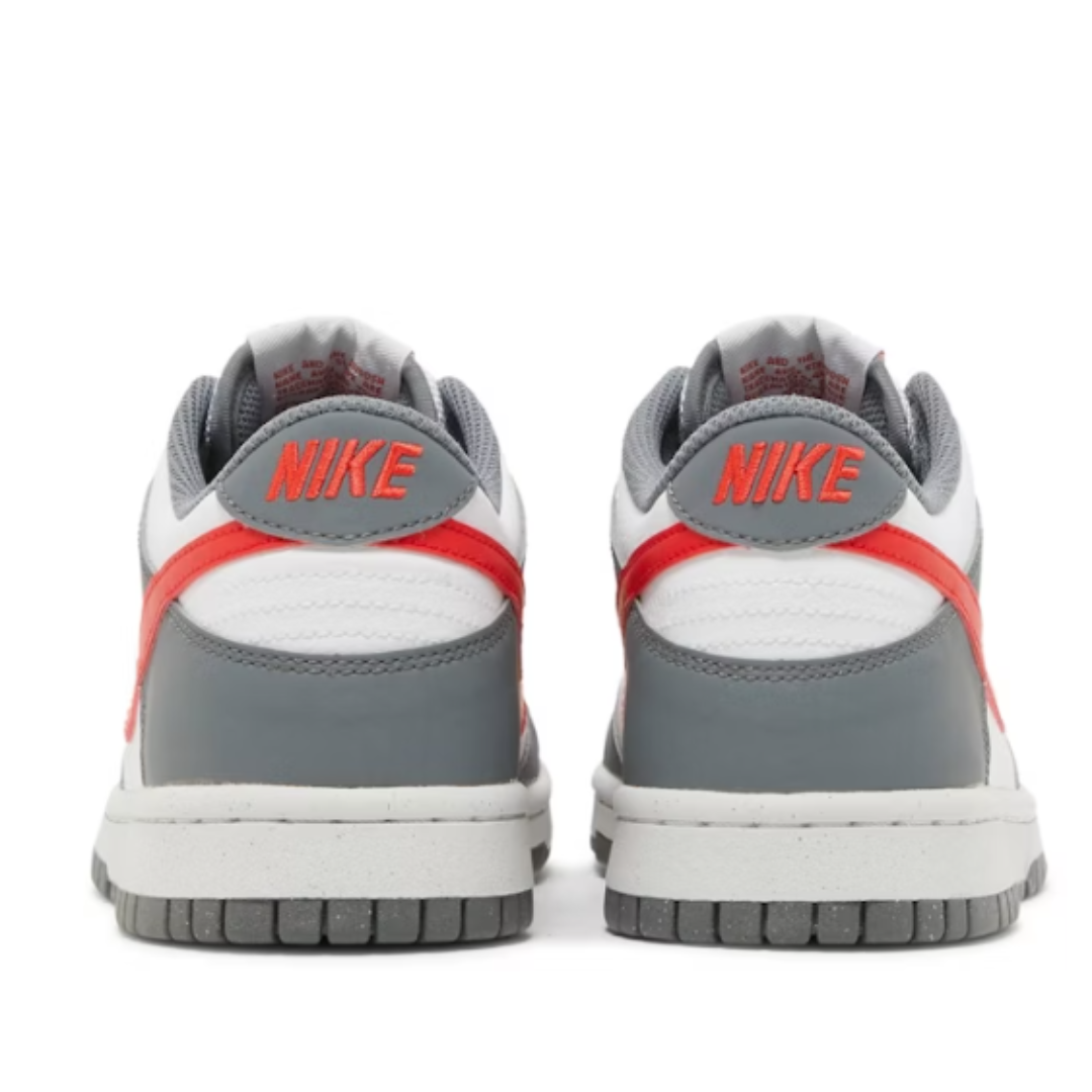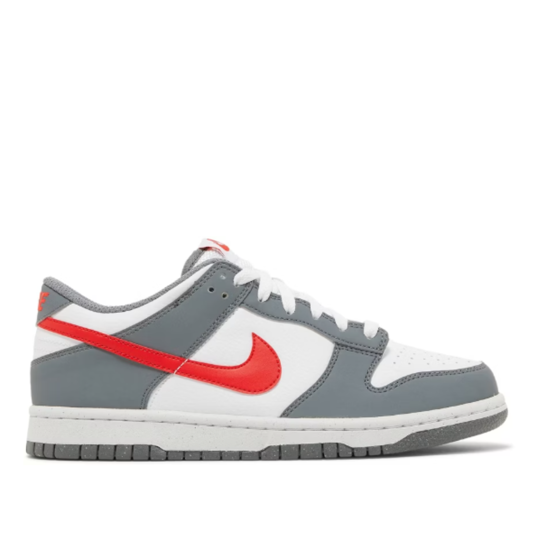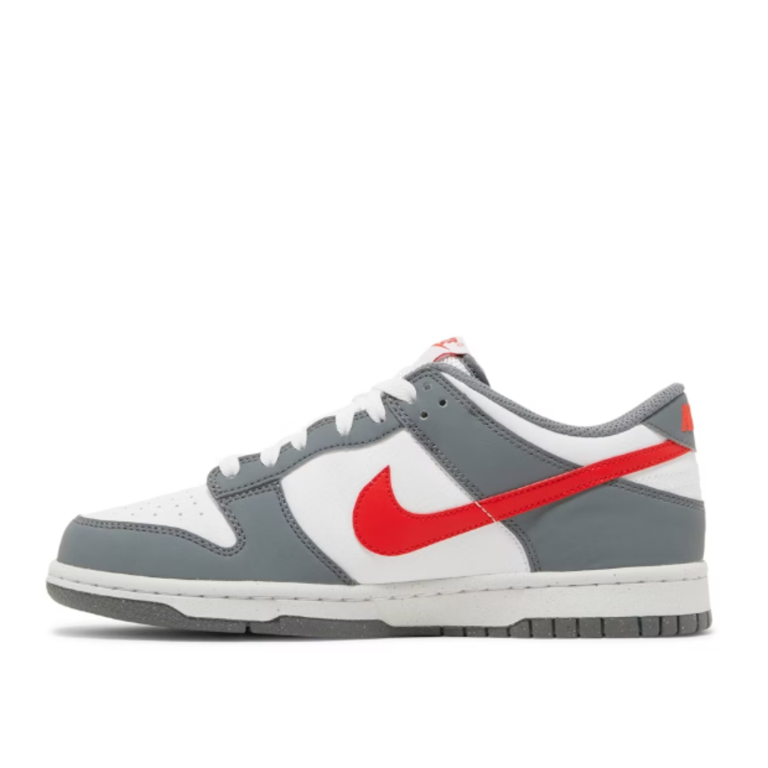 What we appreciate most about this Next Nature sneaker is the speckled foam midsole, providing cushioning by using recycled materials. The speckled gray grind rubber outsole provides traction with rubber made from the waste products of the sneaker making process. The Nike Dunk Low Next Nature Smoke Grey Light Crimson (GS), and environmentally conscious shoe sized specifically for grade schoolers, was released on November 12, 2022 for $85.