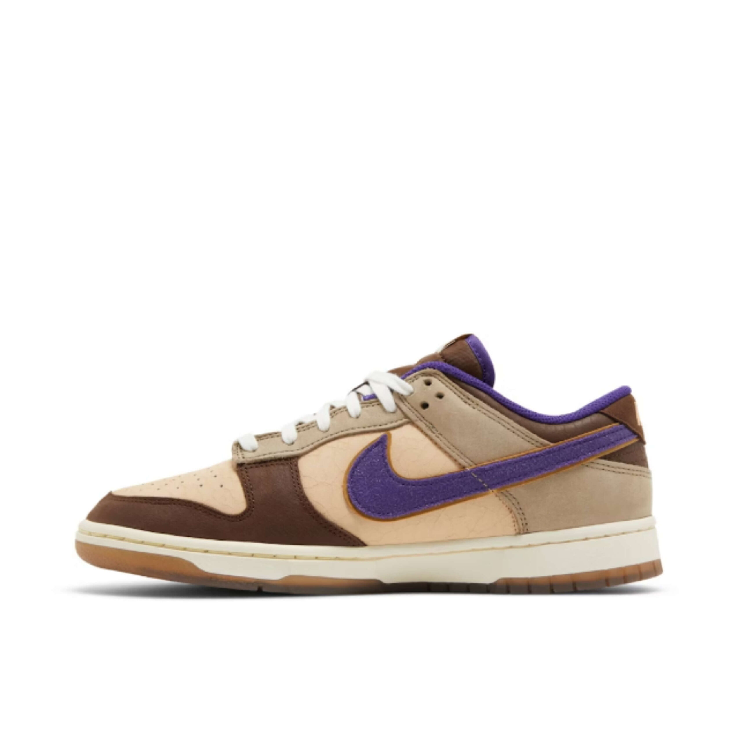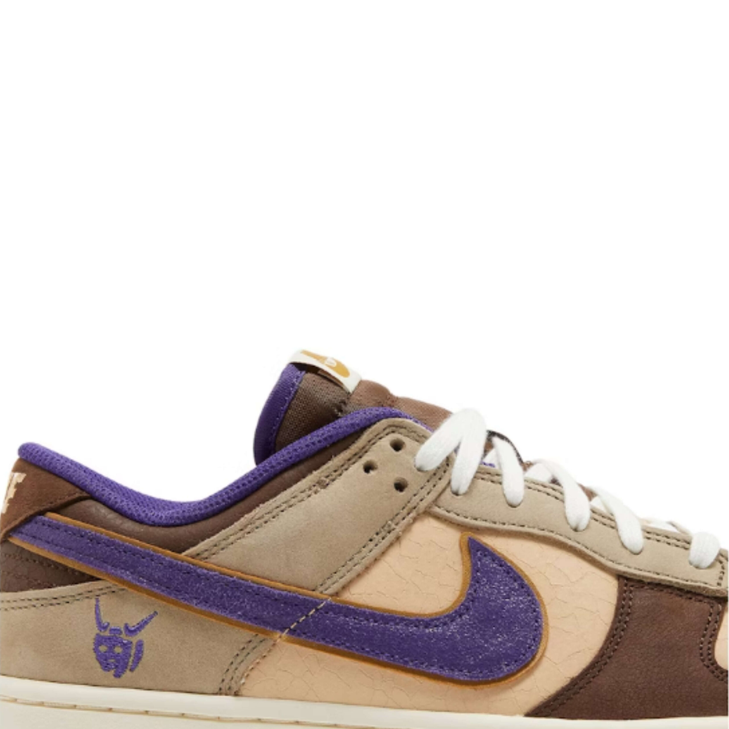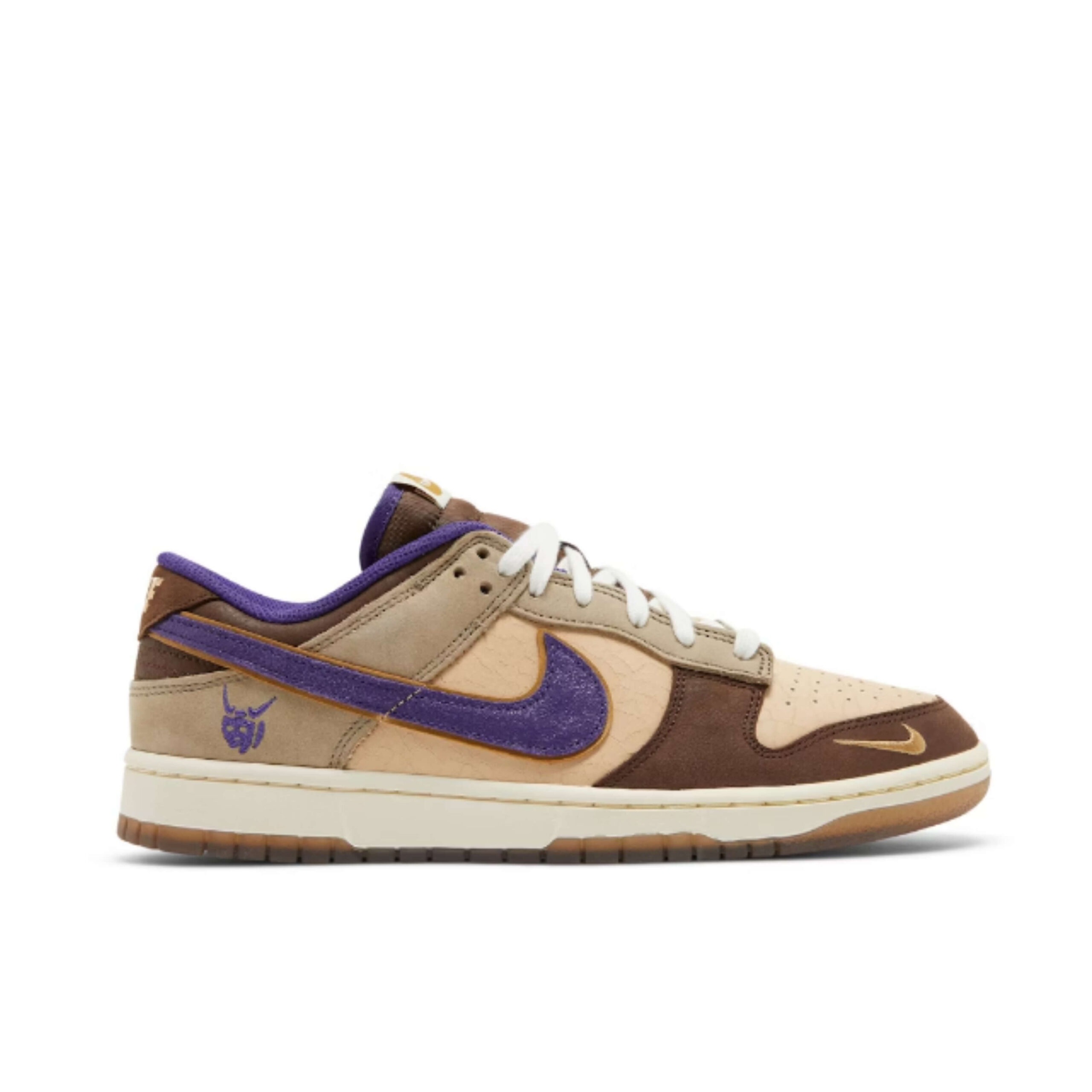 The Nike Dunk Low Setsubun is designed with shades of brown and tan, honoring the beans thrown at the Setsubun Festival. Nike added splashes of purple across the Swoosh, sockliner, and heel logo. The limited edition sneakers come with purple and white laces with gold aglets.