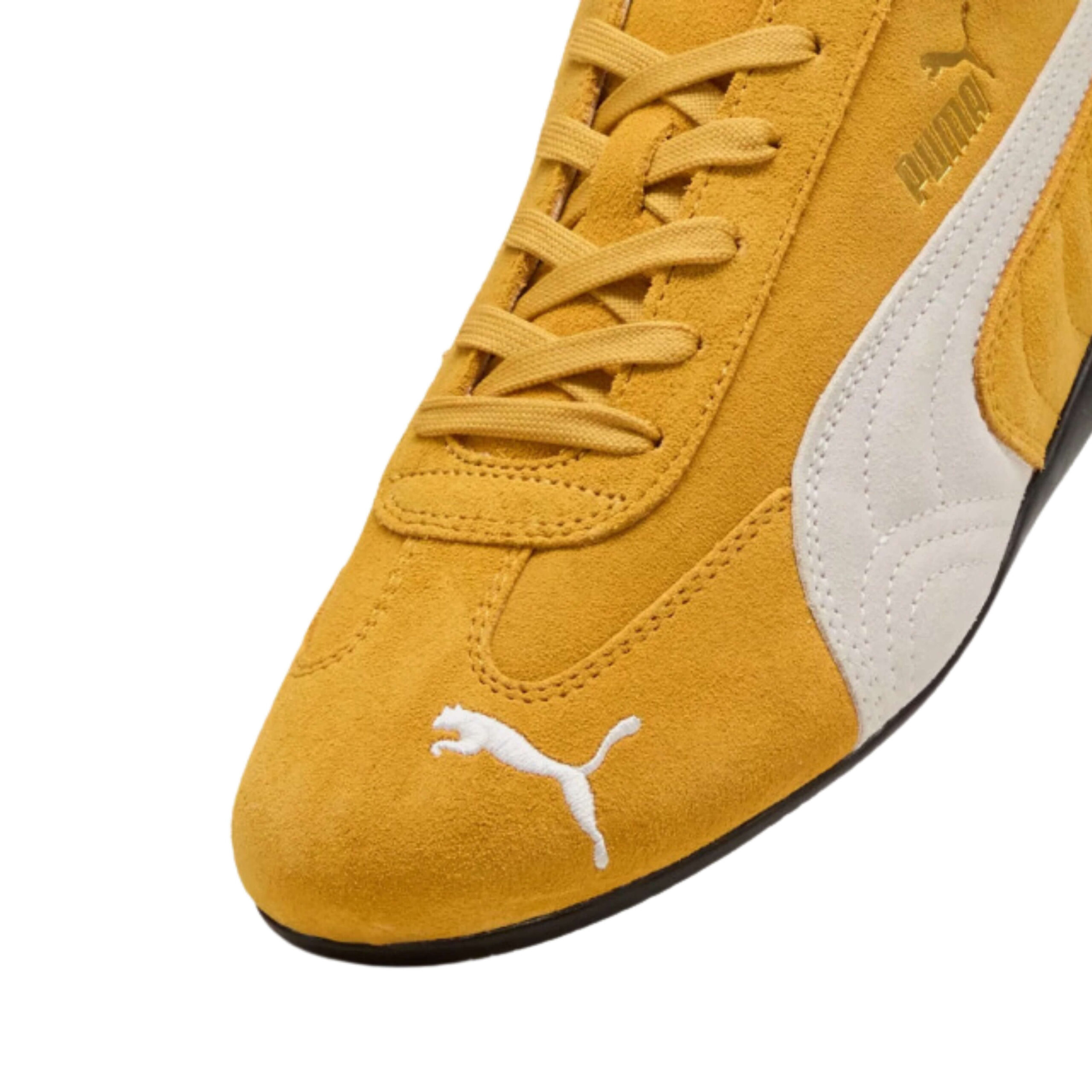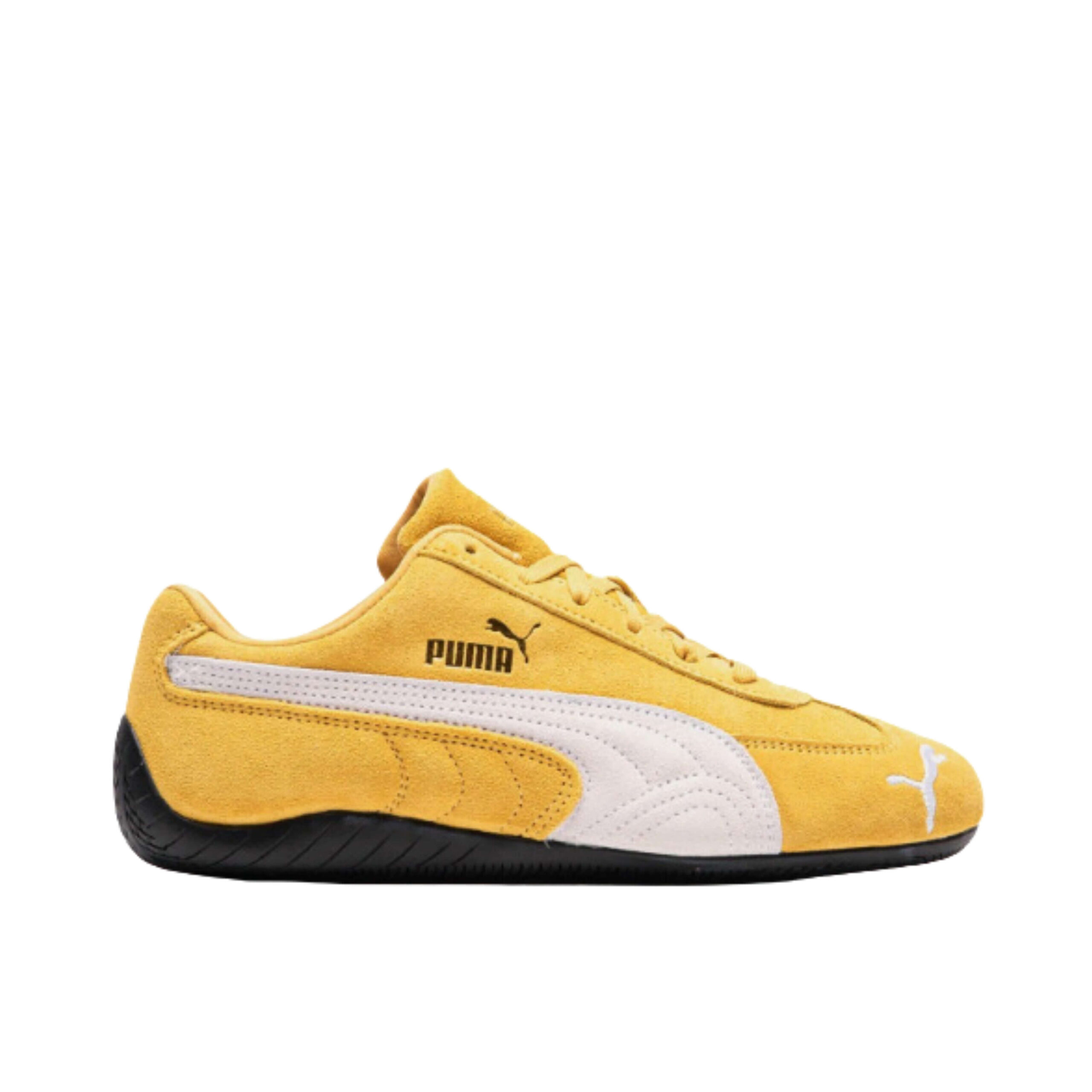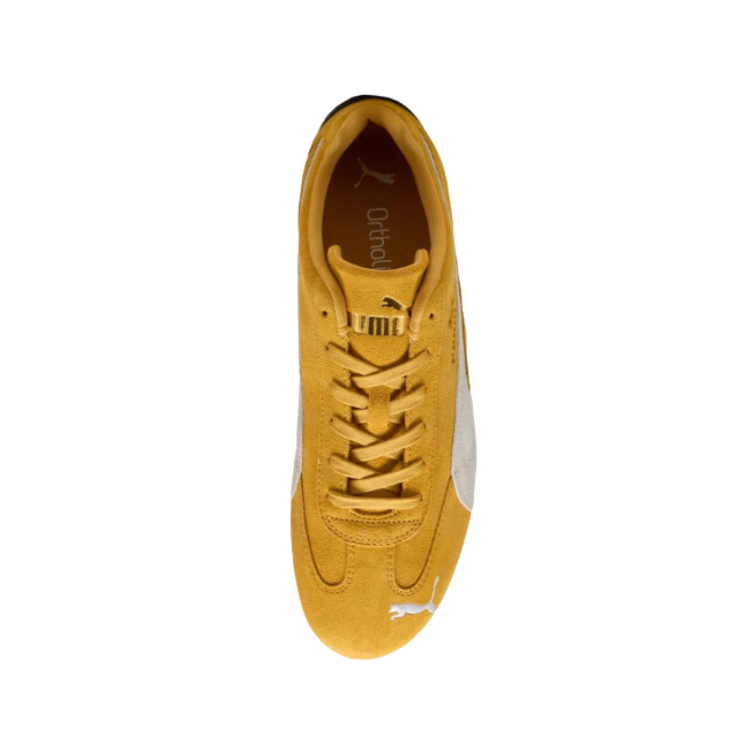 This trendy PUMA Speedcat OG “Archive Gold” offers a solid colour option that can enhance your wardrobe. First created for motorsport, this flat-soled sneaker has been one of the best-selling styles in the brand catalogue since its comeback. This retro shoe arrives in a vibrant yellow suede upper with shiny gold PUMA branding on the lateral panel, tongue, and heel. The white Formstrip decorates the outer section of the Speedcat to complement the embroidered cat logo on the forefoot. An Ortholite sockliner sits directly underfoot for adequate cushioning, shored up by a black rubber outsole with tyre-inspired traction patterns.